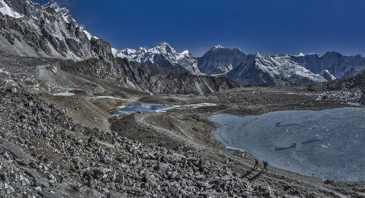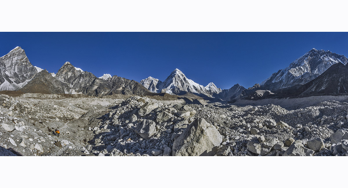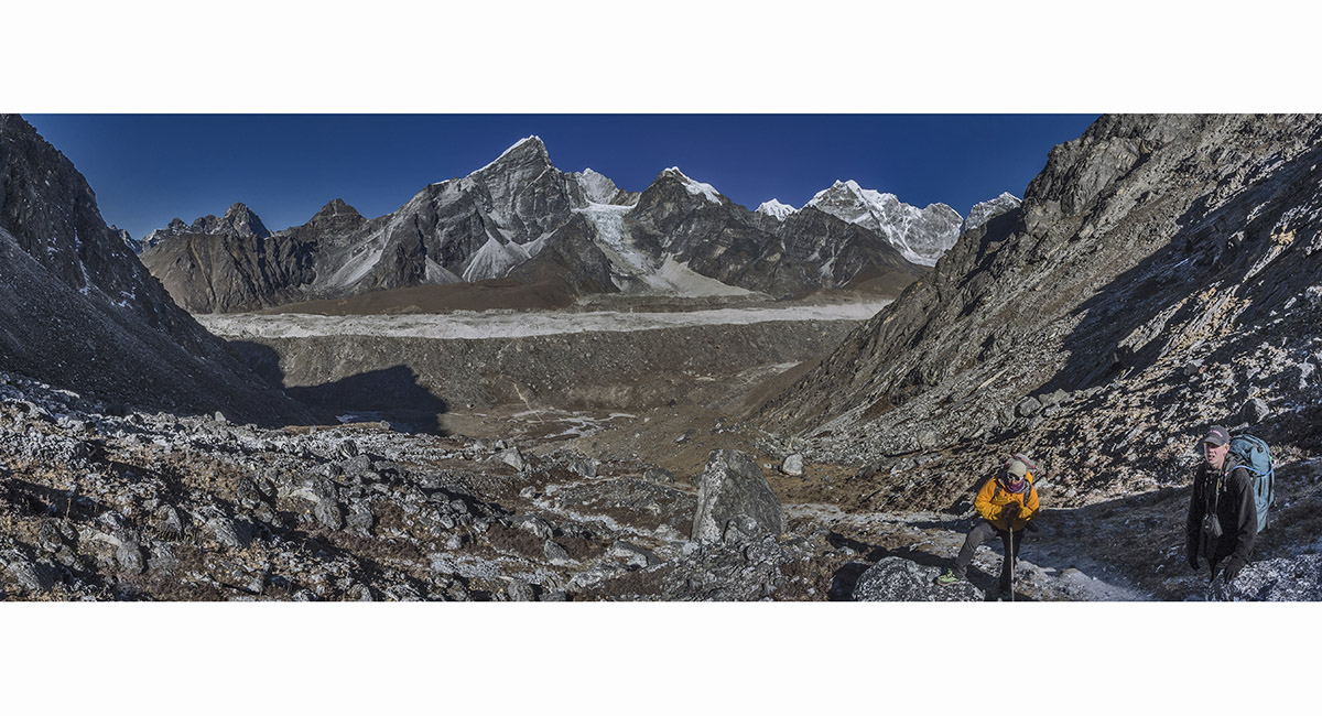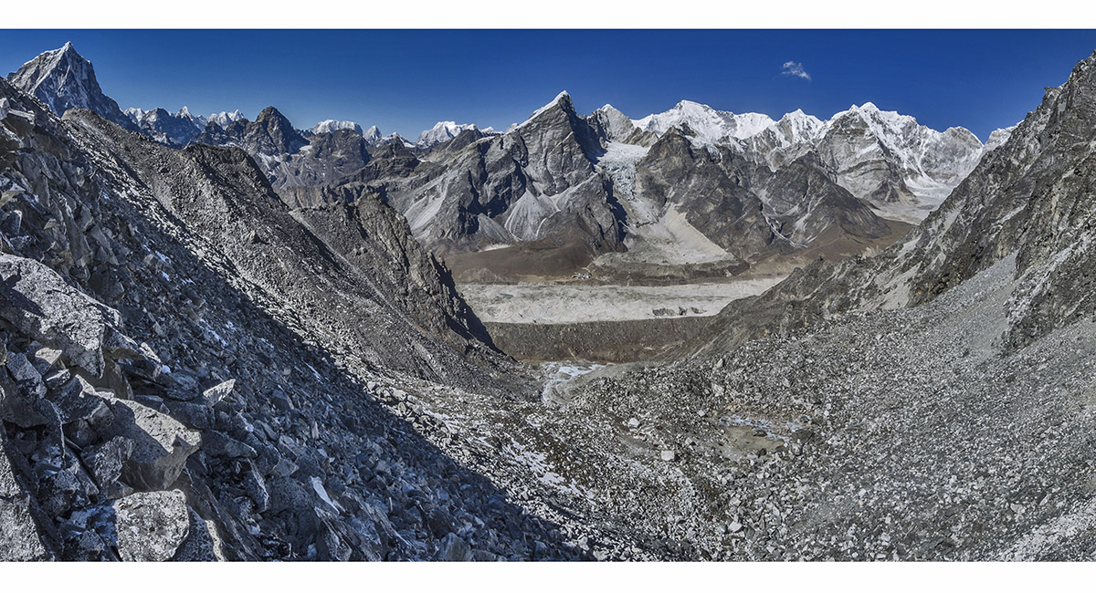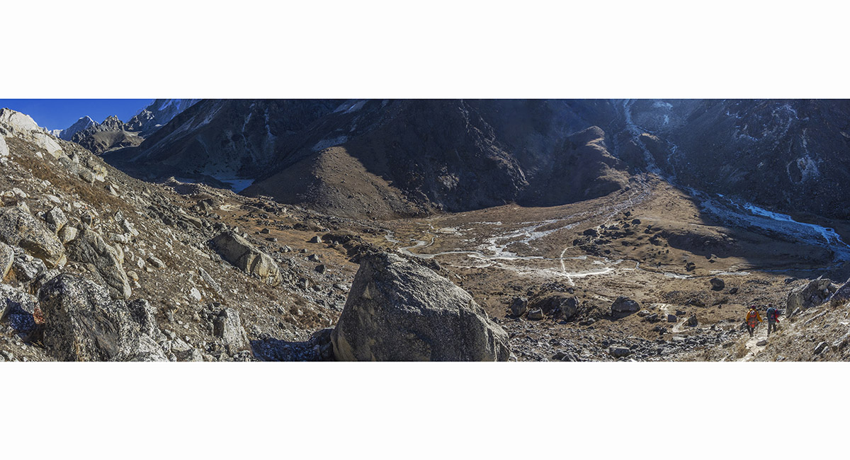 At the base of the trail to Kongma La, looking back to the moraine, with Lobuje East far left and Pumori far right