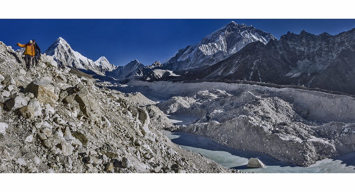 Kami and Ed pick their way through a labyrinth of ice and rock on the Khumbu Glacier