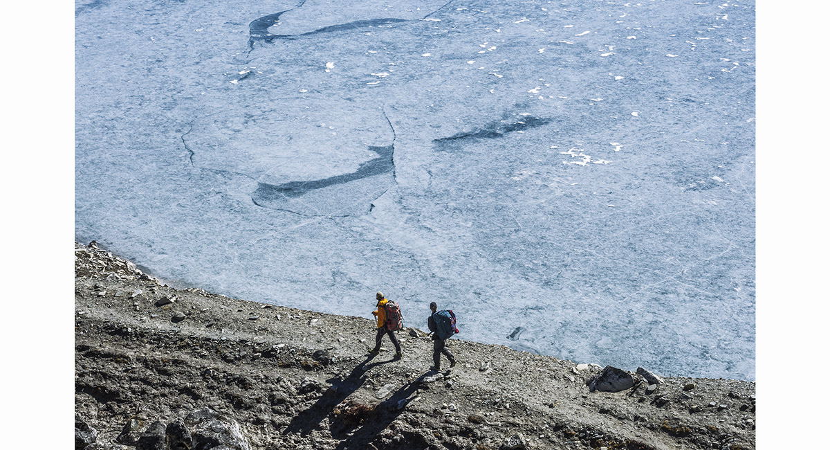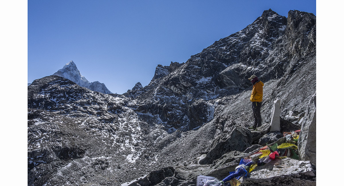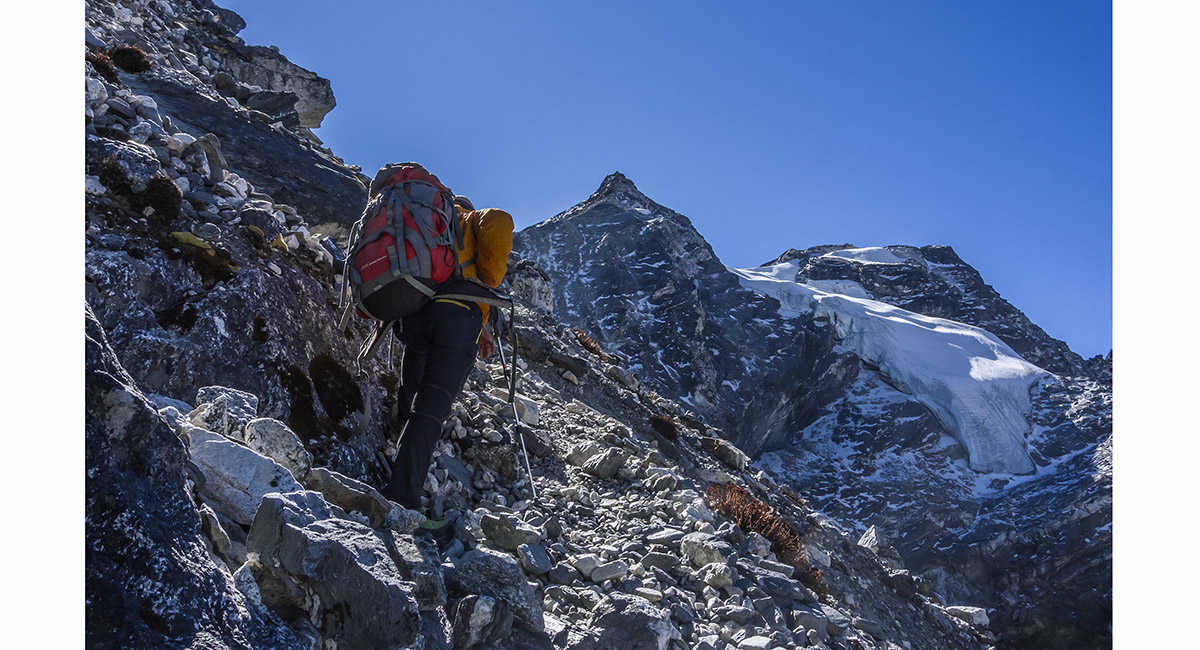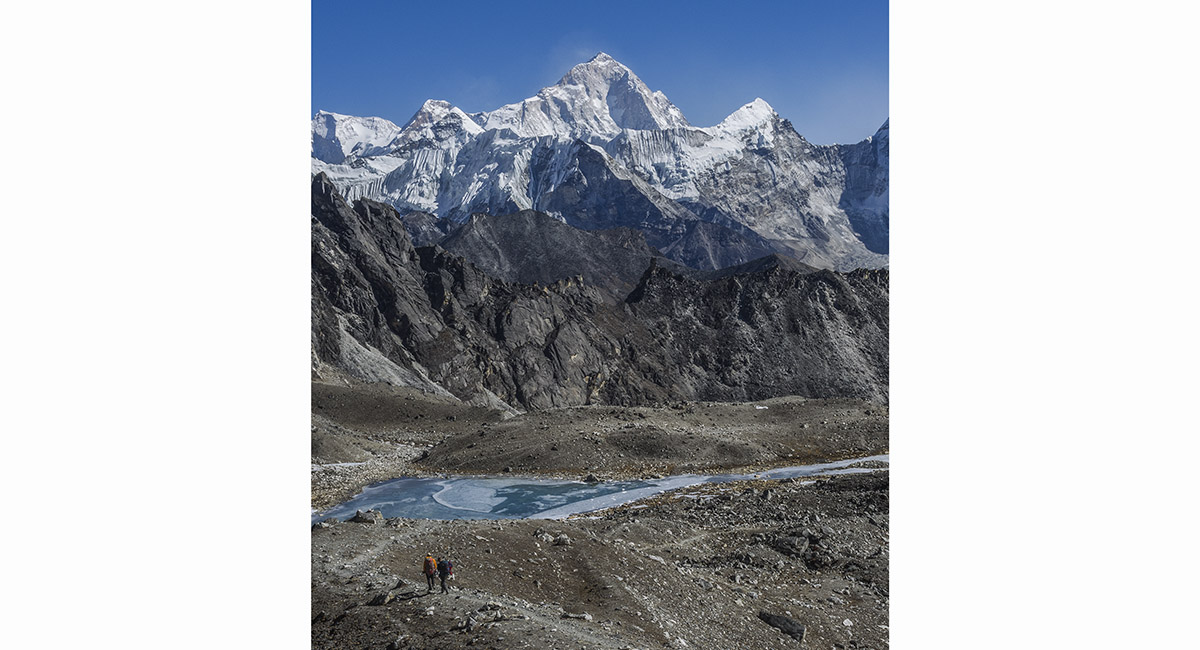 At about 5,500m, on the final section of the trail to Kongma La. The summit of Pokhalde (5,806m) is above the ice field at far right