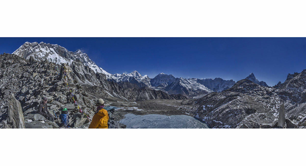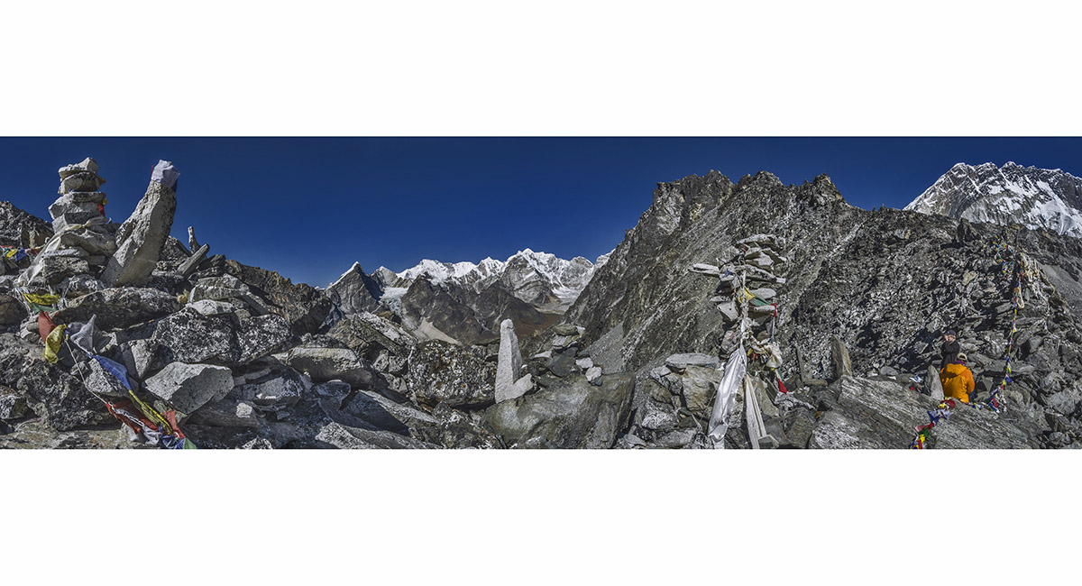 View east from Kongma La (5,535m). From left - Nuptse (7,861m), Lhotse (8, 501m), Makalu (8,485m), Kali Himal (7,057m) and Ama Dablam (6,856m)