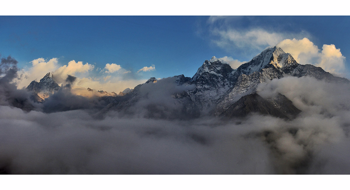 From left, Ama Dablam (6,856m), Malanphulan (6,573m), Kantega (6,685m), Tamserku (6,770m) and Kusum Kanguru (6,367m) from Mong La (3,950m)