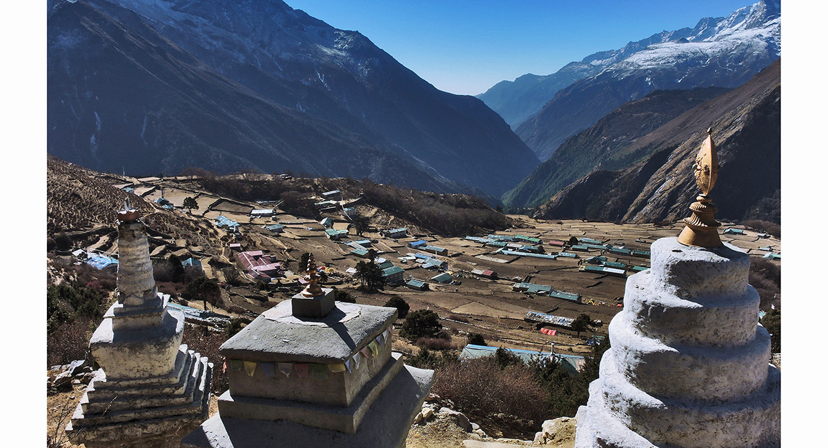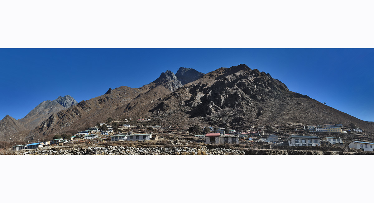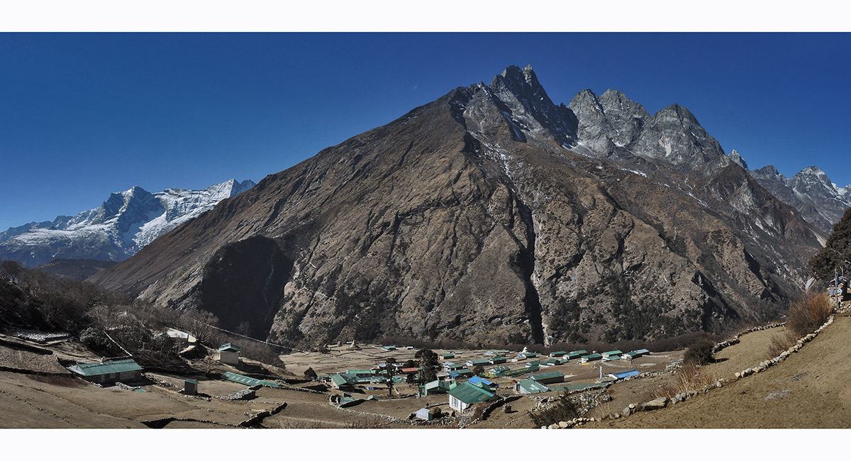 A view of Phortse from the upper northen aspect, with Khumbila (5,761m) behind