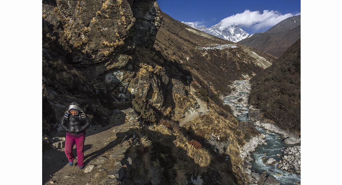 A porter on the trail below Shomare (4,010m), with the Everest group behind