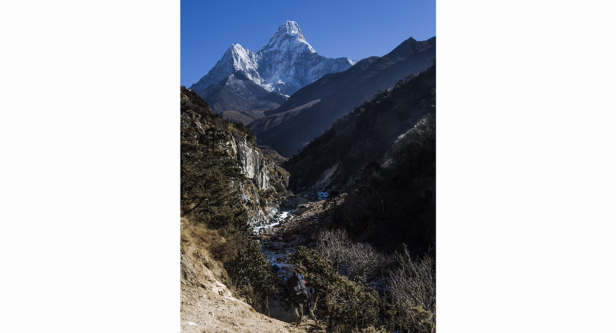 Approaching the crossing of the Imja Khola below Pangboche, with Ama Dablam above