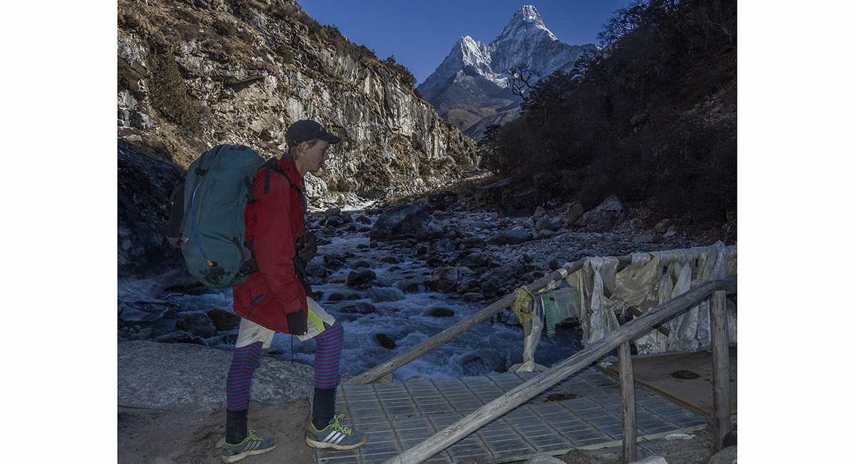 Crossing the Imja Khola, with Ama Dalam behind. This bridge was recently installed after the main bridge was destroyed by the earthquakes