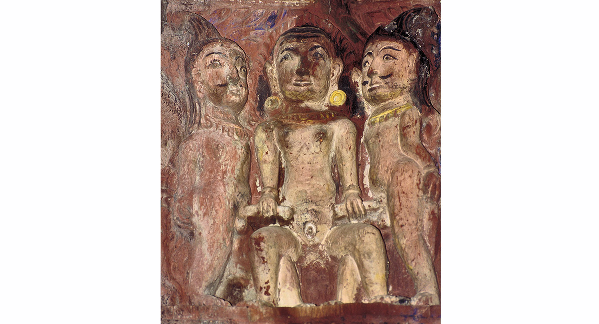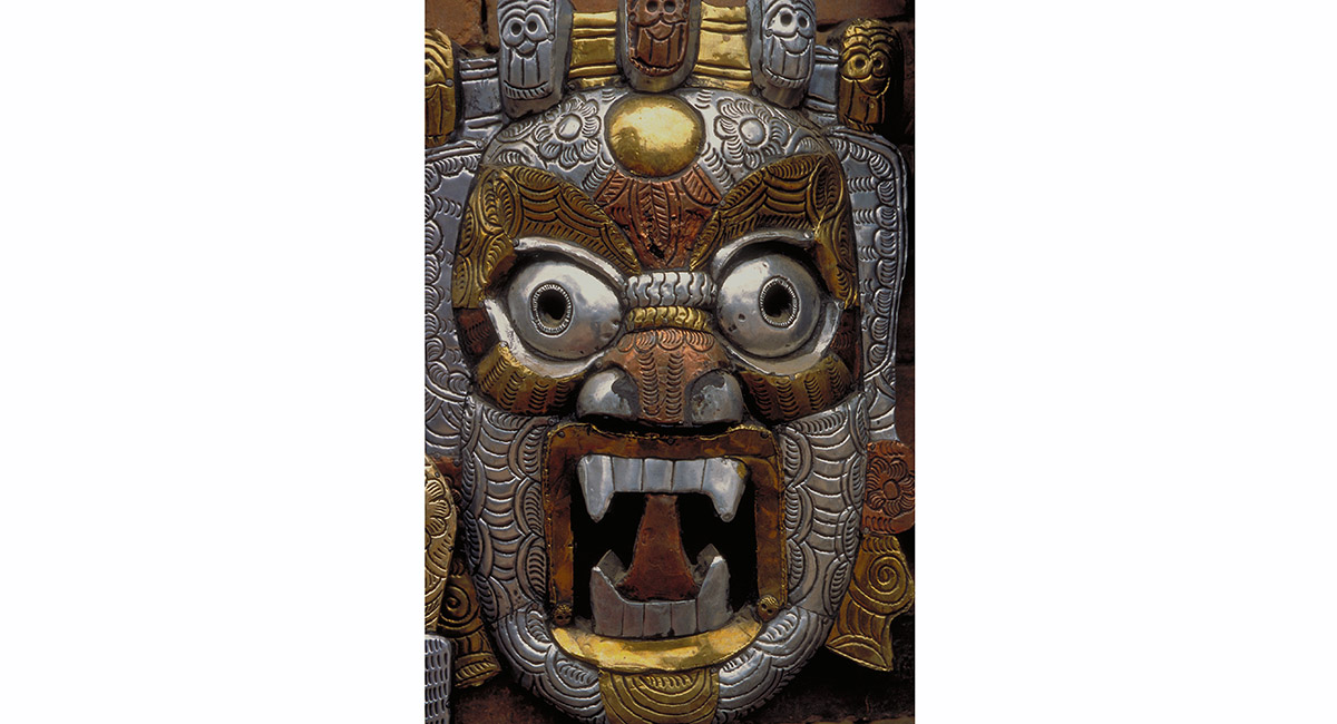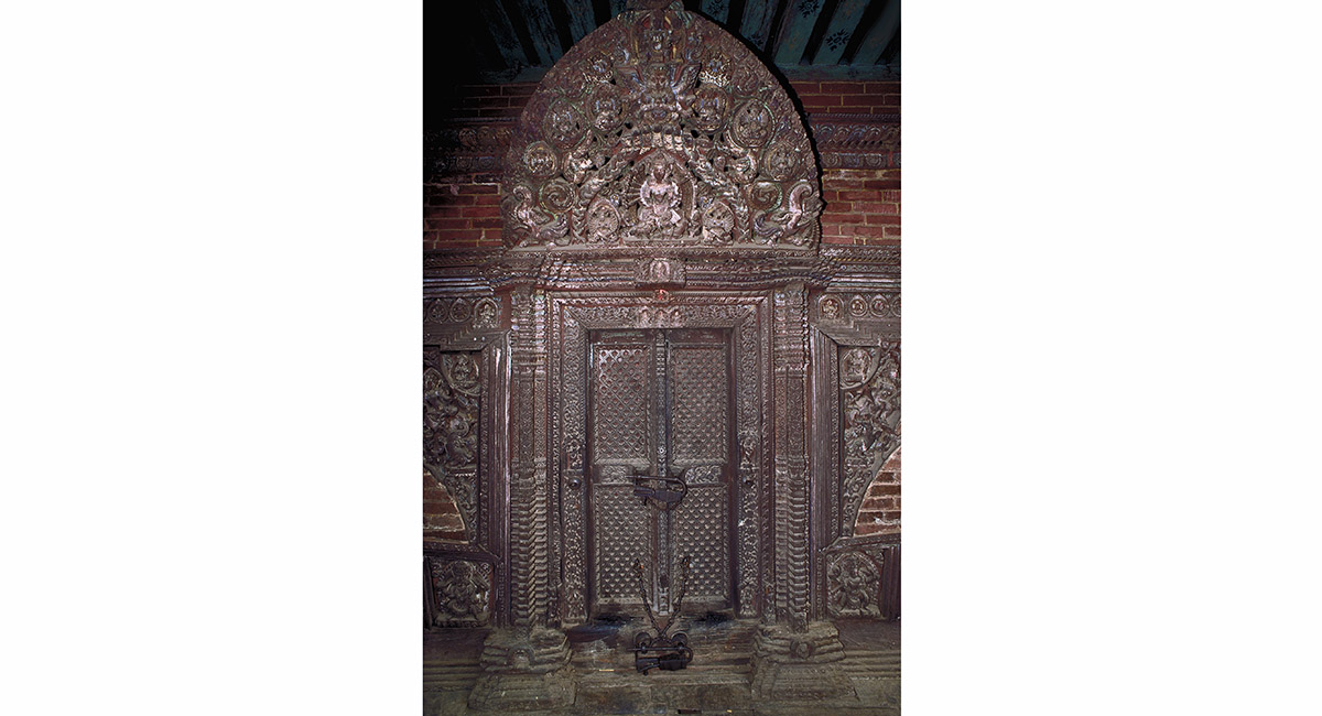 A fine example of the intricate wood carving that typifies Kathmandu adorns the doorway of a Hindu temple, Bhaktapur