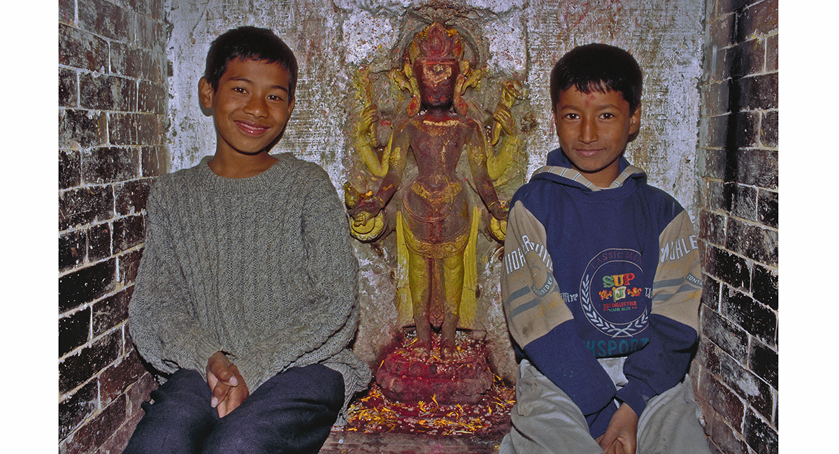 Nepali boys with characteristic grims, inside a small Hindu shrine, Bhaktapur