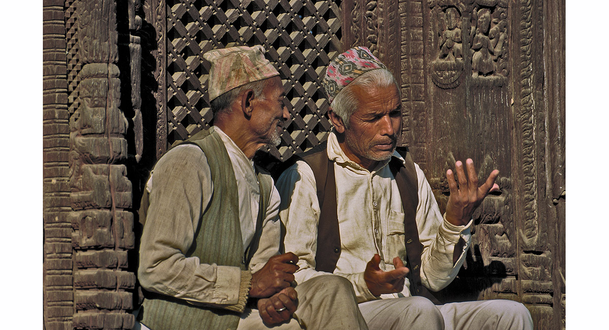 Local Newars, with their characteristic pill-box caps, in Bhaktapur Durbar Square