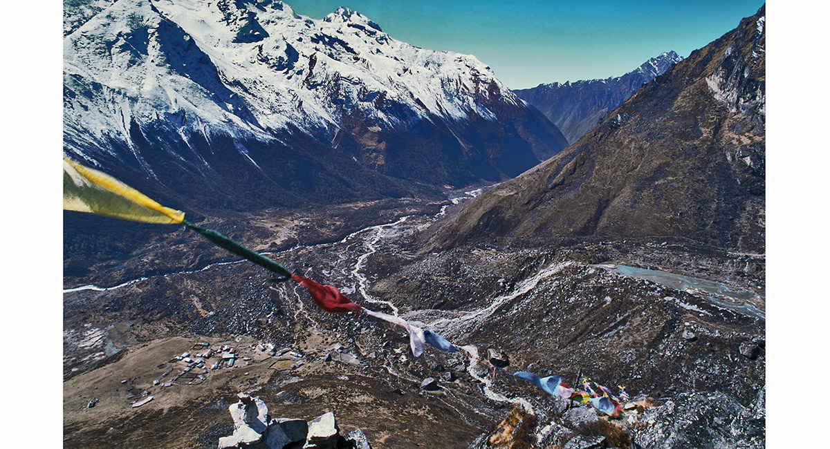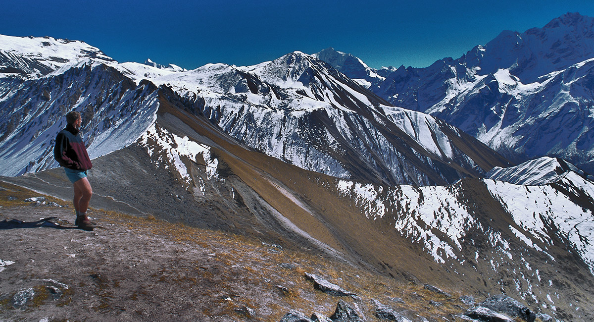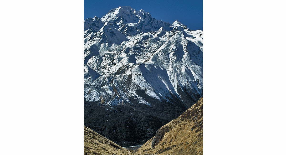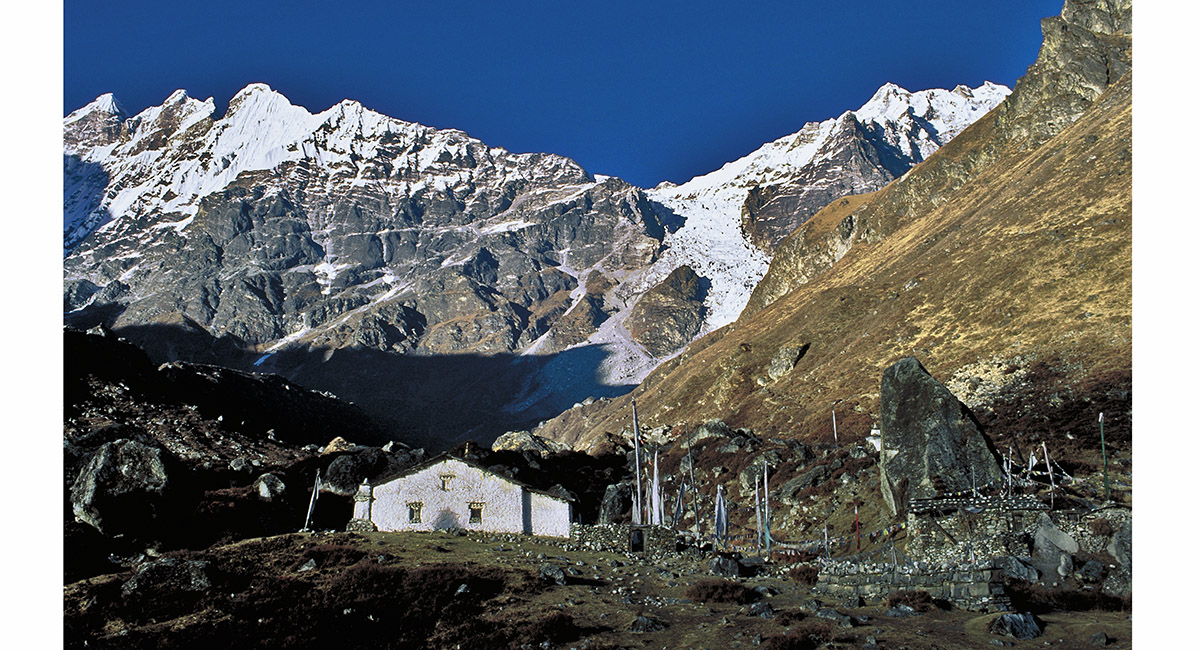 From Kyanjin Ri there is an uninterrupted view directly across the valley to the vast, south east face of Langtang Lirung