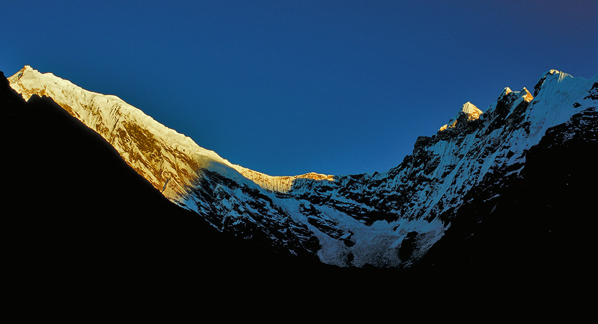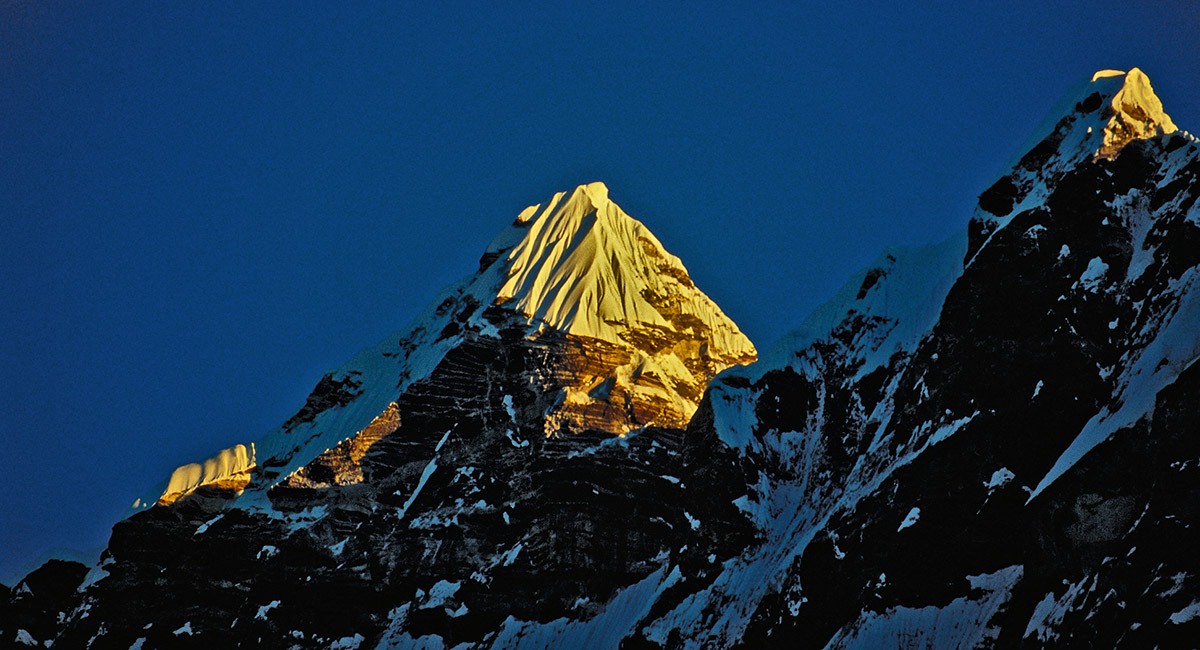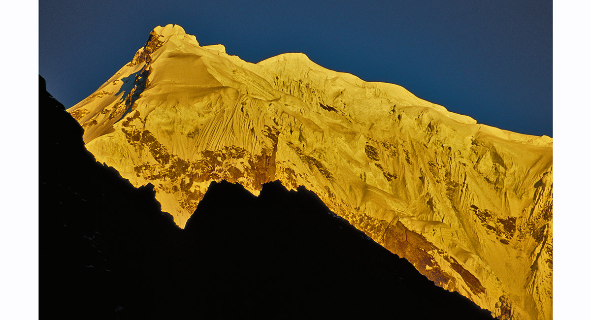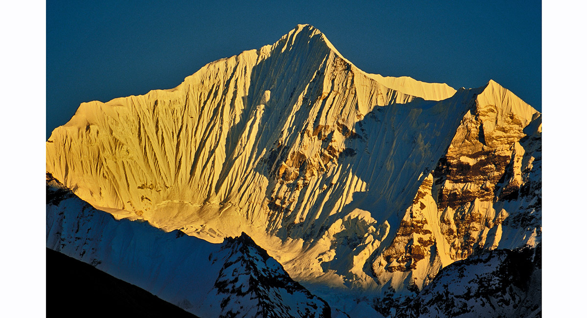 Viewed from Kyanjin Gompa, sunset transforms the fluted ice of Lenpo Gang (7,083m) into a gigantic wall of gold