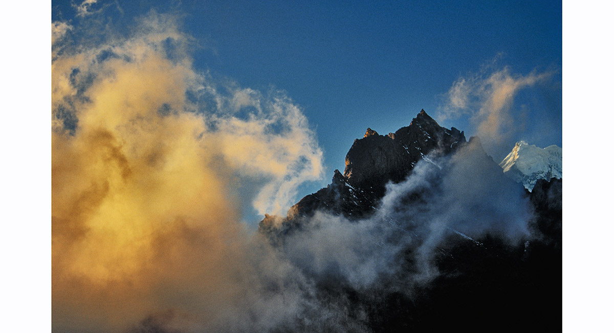 As the sun sinks below the surrounding mountains, the last of the afternoon cloud swirls into its disappearing act. Viewed from Kyanjin Gompa
