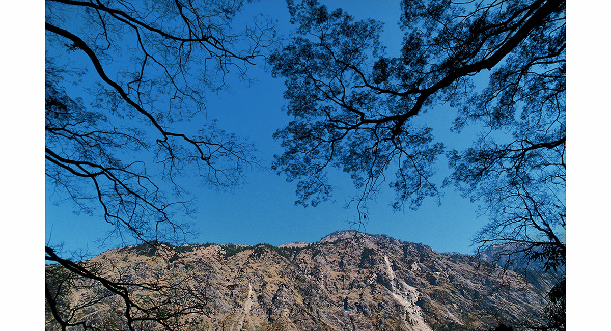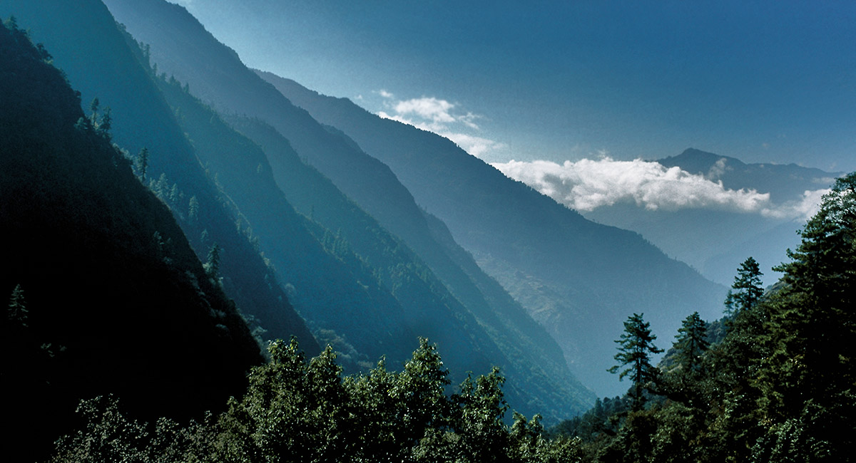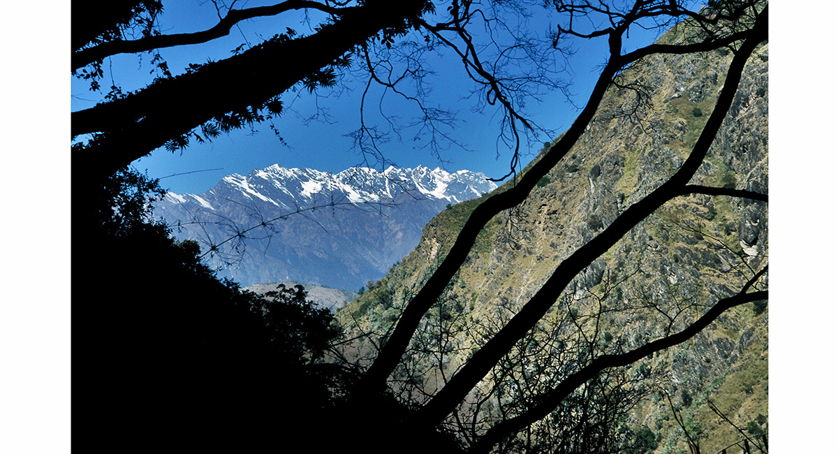 On the ascent above Landslide lodge, this view through "electric wood" is of the huge valley walls across the Langtang Khola