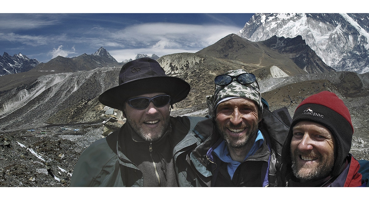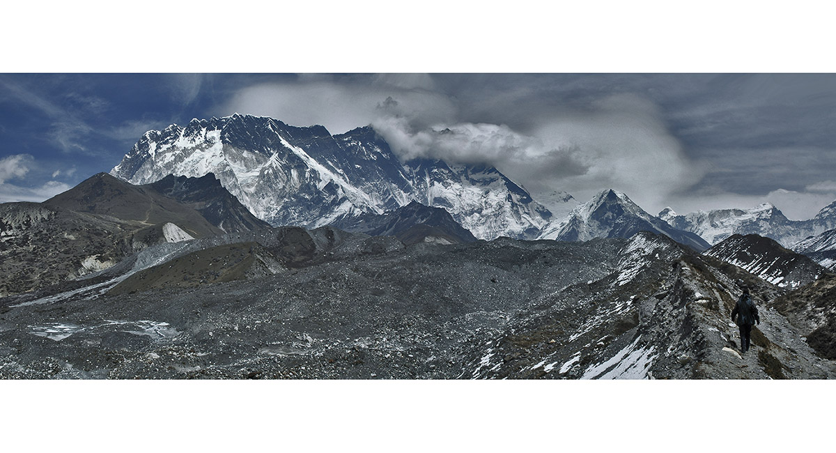 A view up the Lhotse Glacier to Island Peak (6,189m, right) and Chhukung Ri (5,550m, left). The Nuptse wall (7,861m) dominates the skyline, with Lhotse (8,501m, centre) hidden in cloud