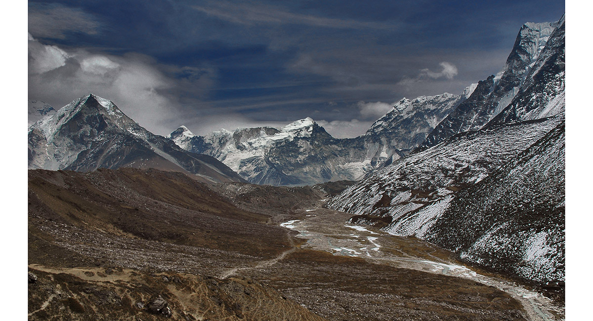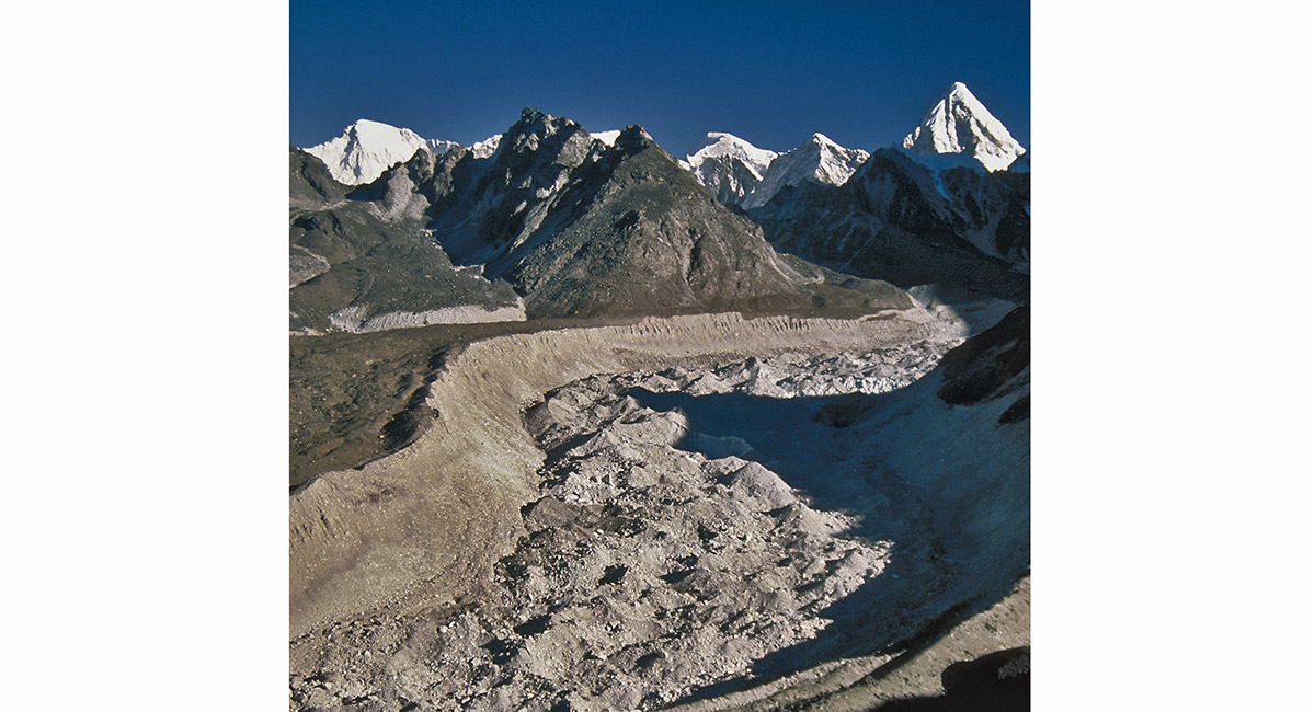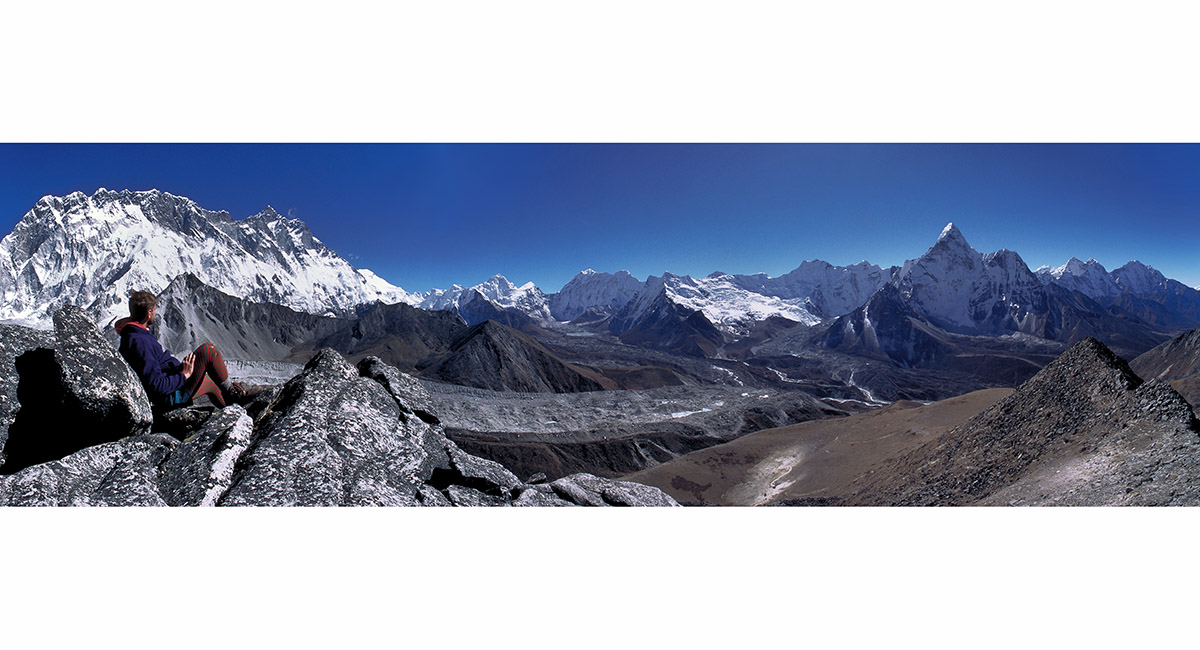 View from Chhukung Ri (5,550m), up the Nuptse Glacier. Kongma La (5,535m) is far left. The black rocky peak left of centre is Kongma Tse (5,820m). And the beautiful white pyramid at right is Pumori (7,165m)