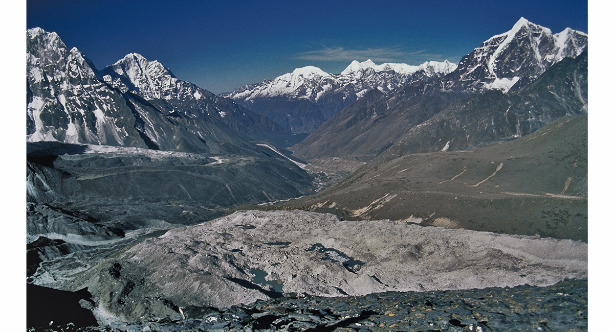 View from Chhukung Ri (5,550m), across the lower Nuptse Glacier and back down to Dingboche (4,410m). From left along the skyline are Kangtega (6,685m), Tamserku (6,608m), Kwangde (6,187m) and Tawoche (6,367m)