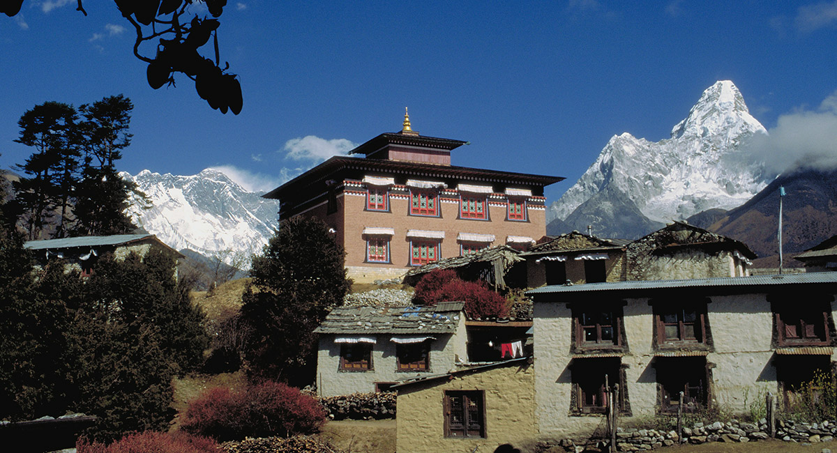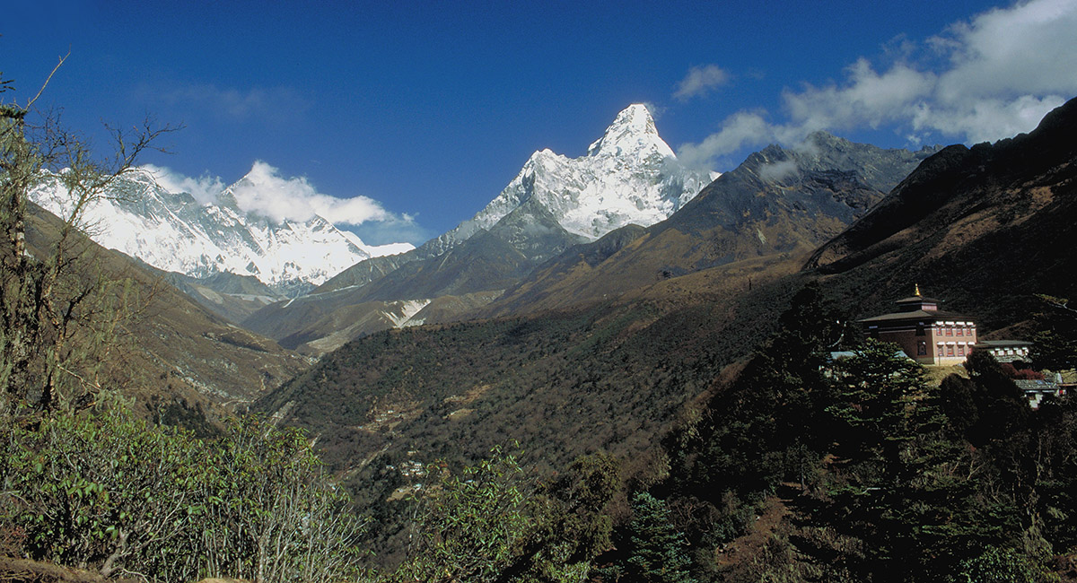 Tengboche Gompa (pre fire), right foreground (3,867m), with the Nuptse/Everest/Lhotse group to the left and Ama Dablam to the right