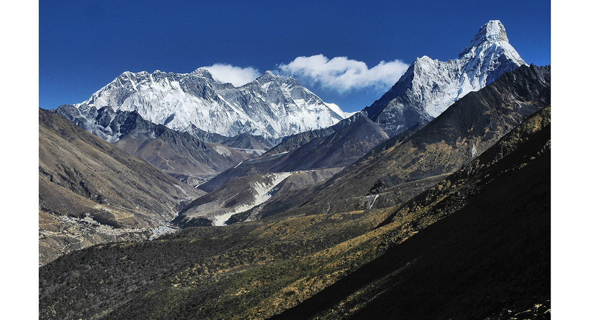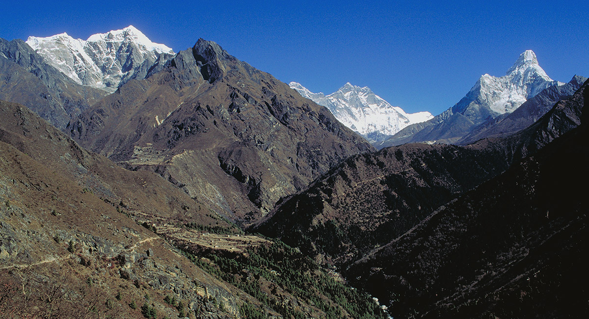 From left, Tawoche, Lhotse and Ama Dablam, seen from the Tengboche to Namche Bazaar trail, nearing Namche Bazaar. Tengboche is on the ridge beneath Ama Dablam (right side)