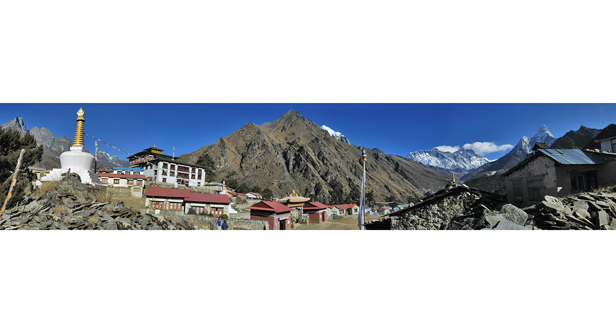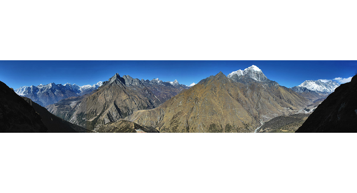 A slightly different perspective on the classic Everest group panorama, taken about 500m above Tengboche, with Pangboche at bottom left