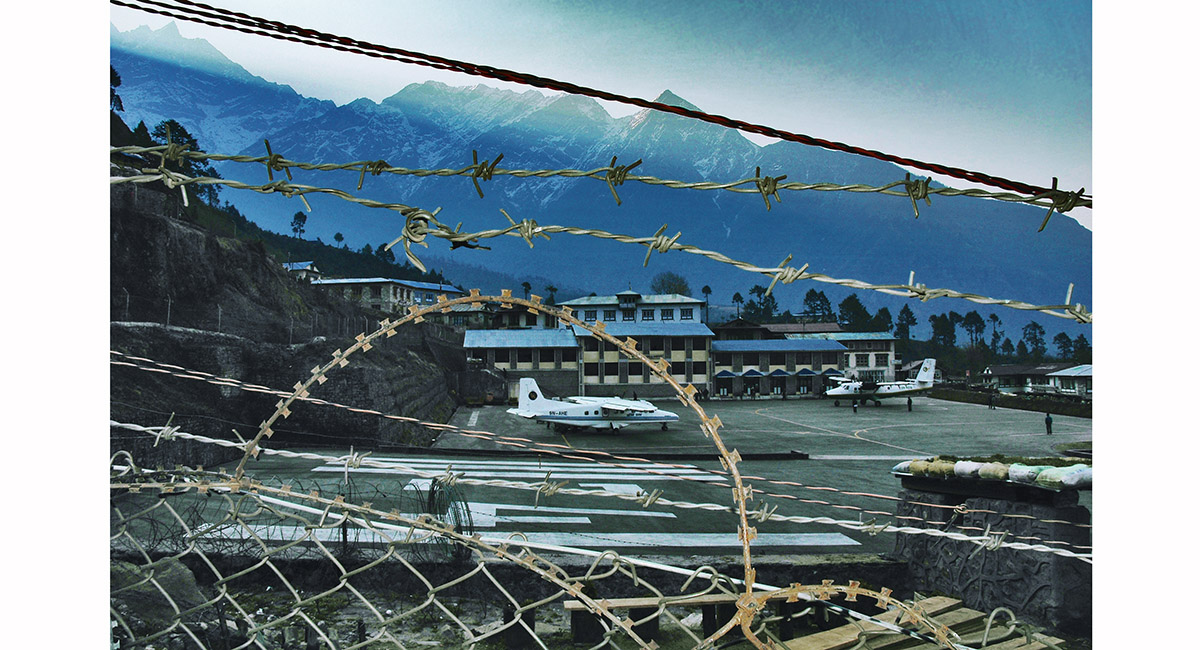 Looking through barbed wire to Lukla airstrip during political unrest in 2006