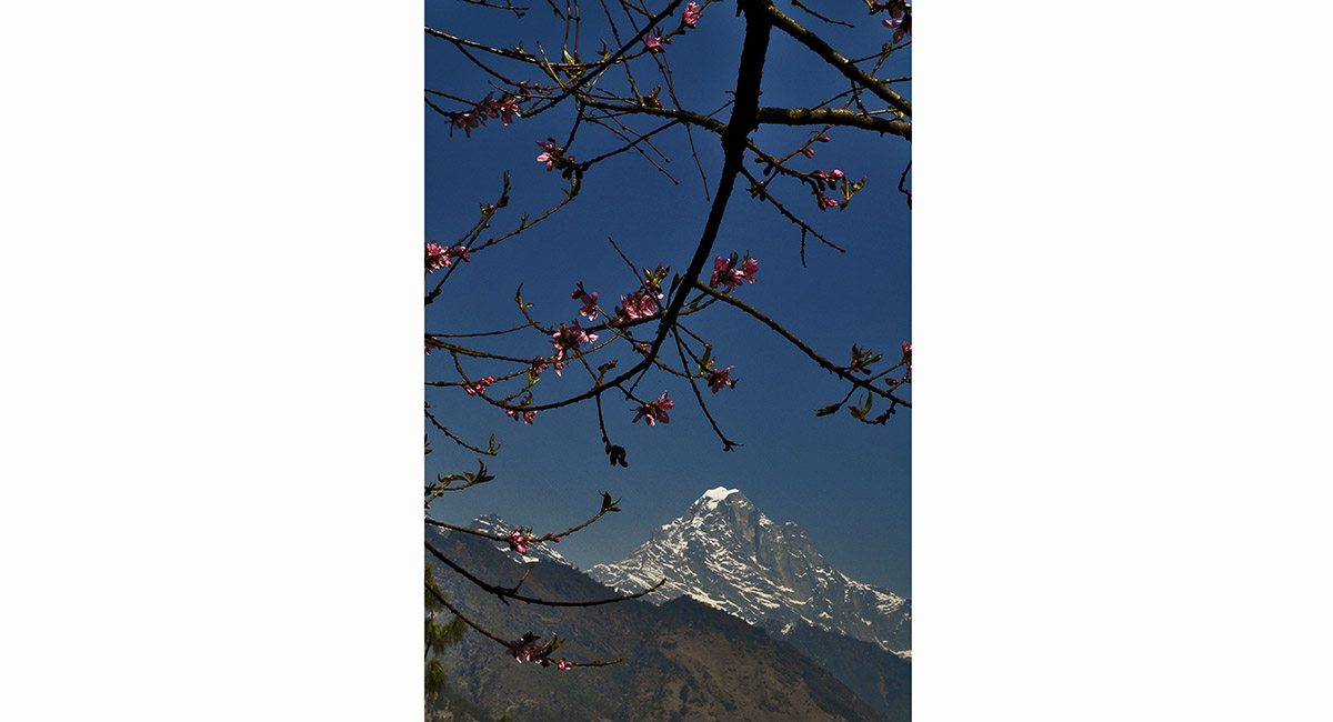 A closer view of the first sighting of Chomolungma - Main summit far left, then the Hillary Step and South Summit), behind the mighty wall of Nuptse, with Lhotse far right