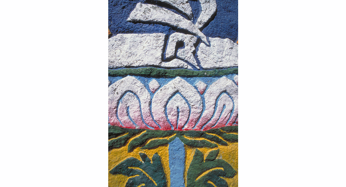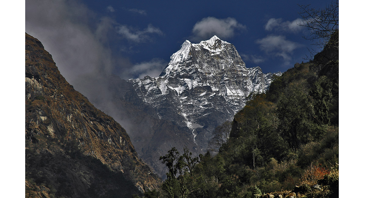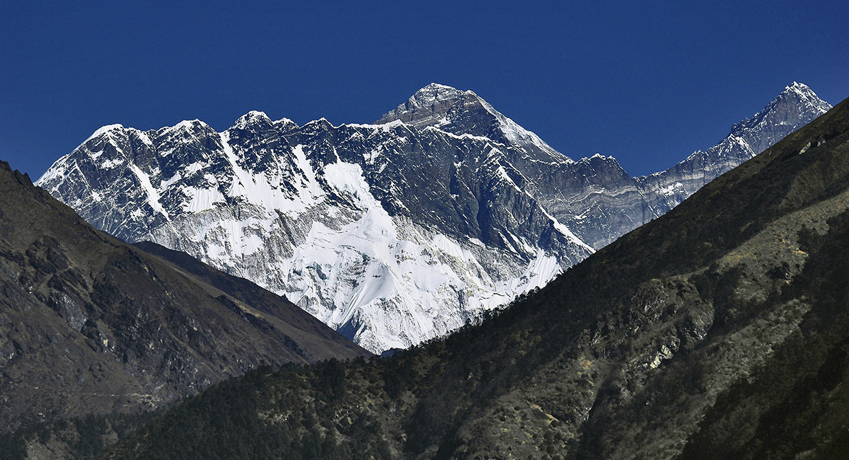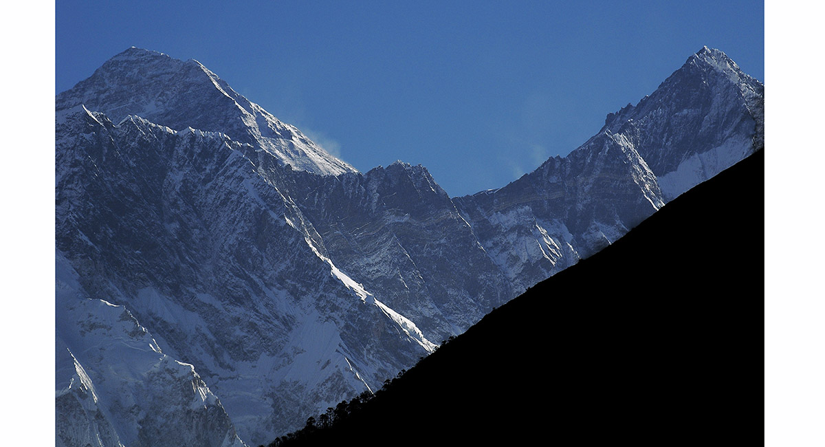 First sighting of Chomolungma, behind the mighty wall of Nuptse, with Lhotse far right
