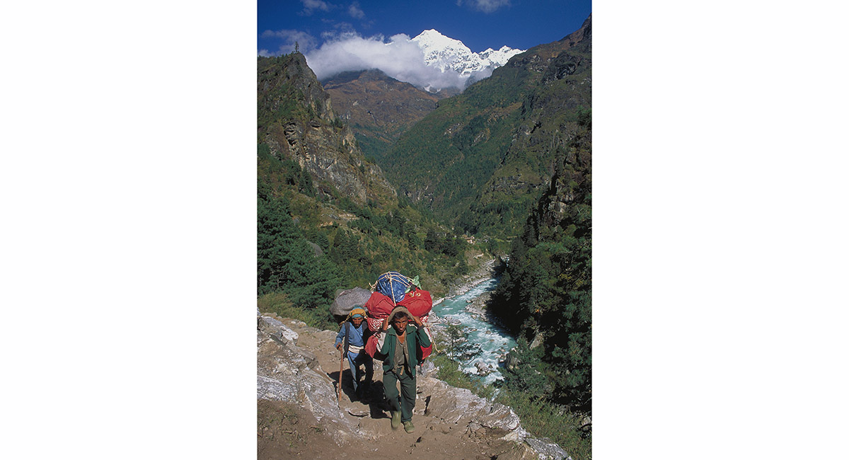 Porters on the trail near Phakding, with the Dhud Kosi River and Kusum Kanguru (6,369m) behind