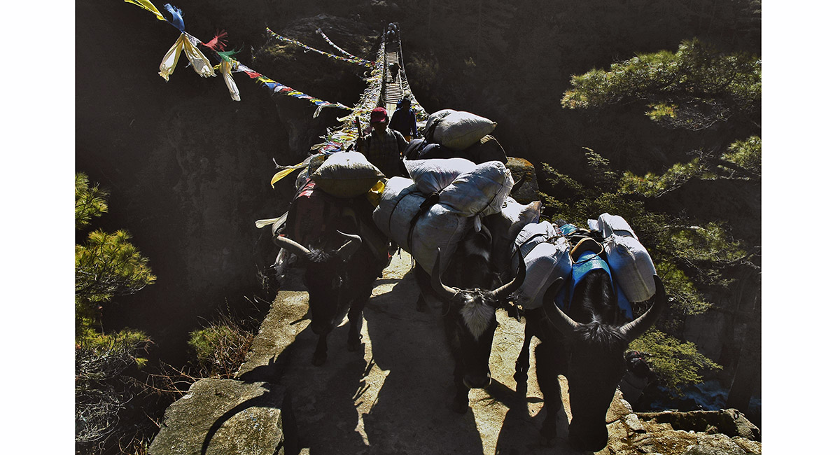 Load carriers crossing the swing bridge over the Modi Khola, before the ascent to Namche Bazaar. Don't get in their way - they don't like it on the bridge and it's a long fall to the river