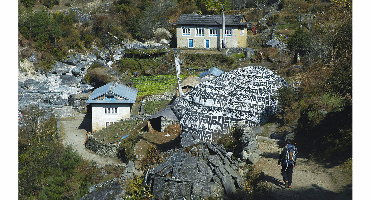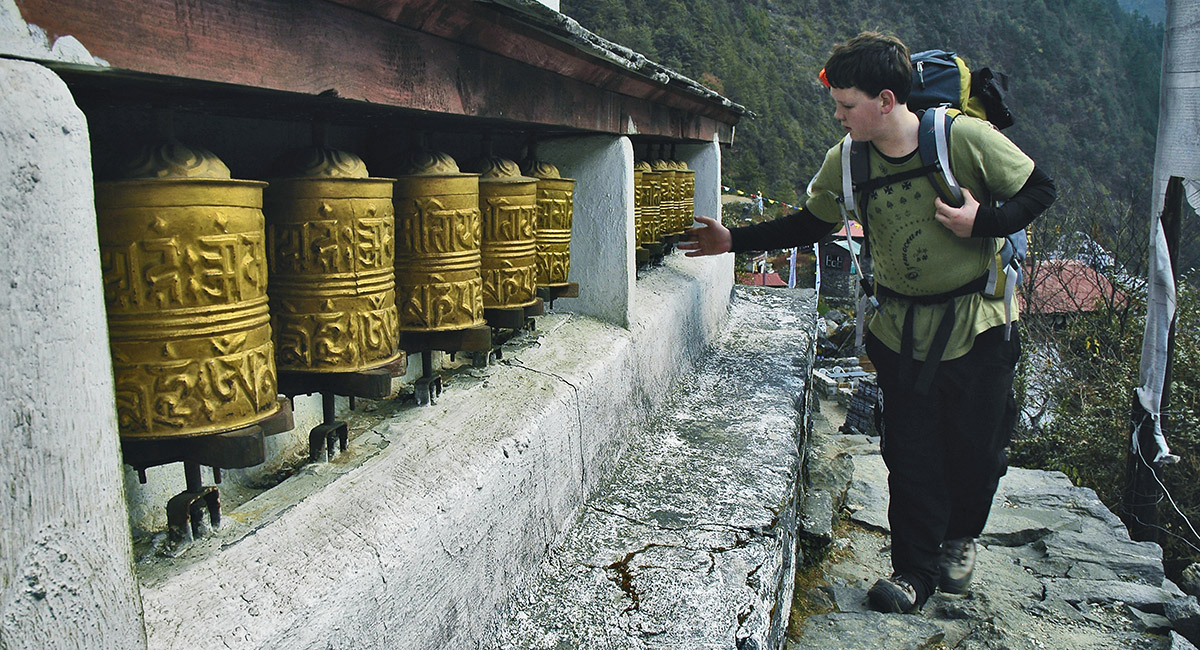 Ben gets acquainted with the prayer wheel routine on Khumbu trails