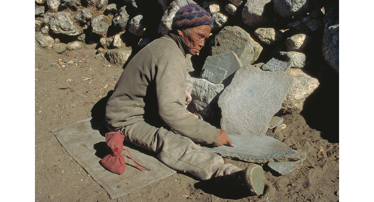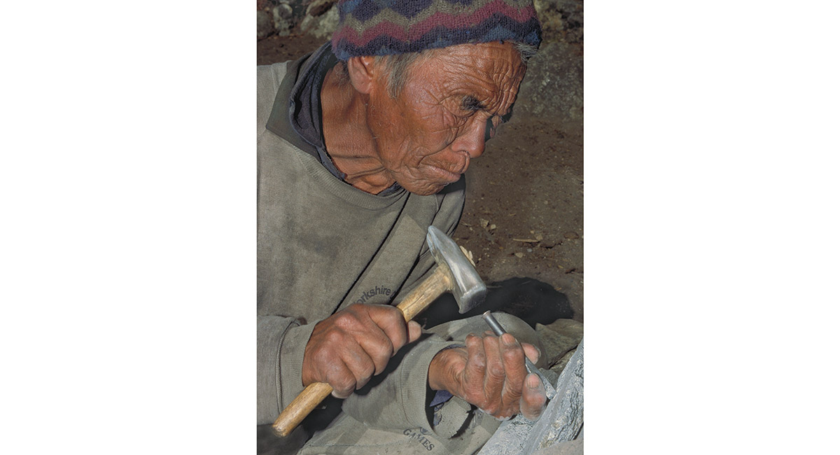 Ang Kin Zum, 77 year old mani stone carver in action, upper Pangboche