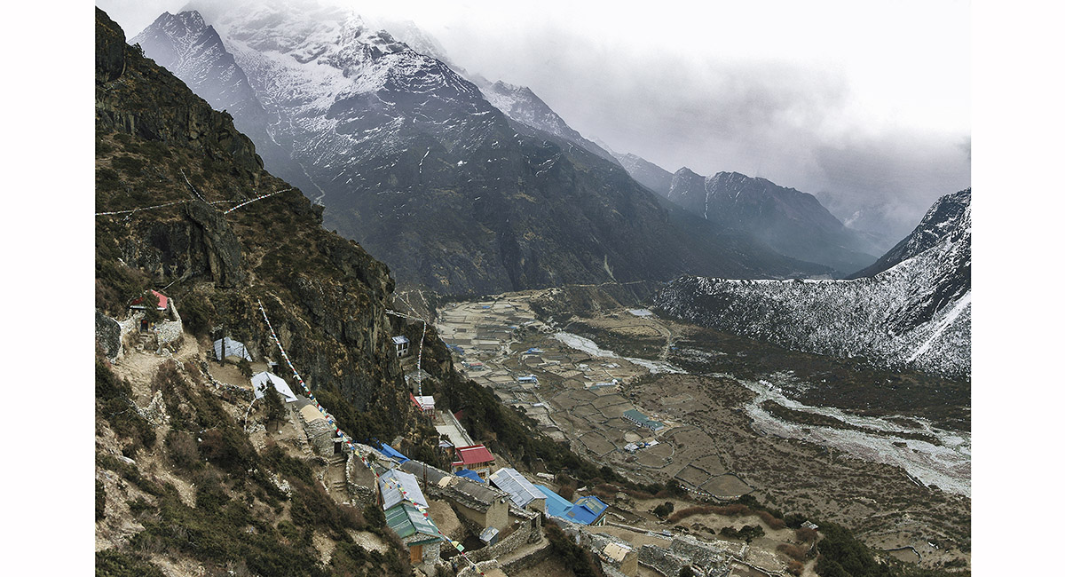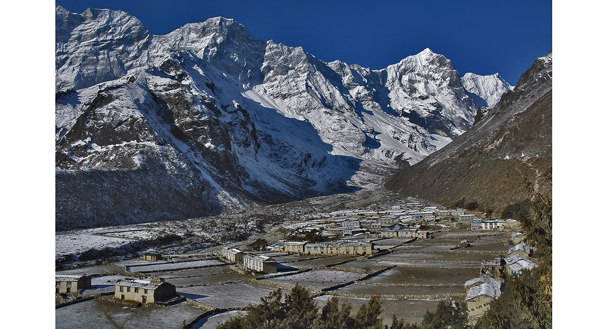 Thame Gompa on the right, dwarfed by Tengkang Poche (6,500m) and Panayo Tuppa (6,695m)