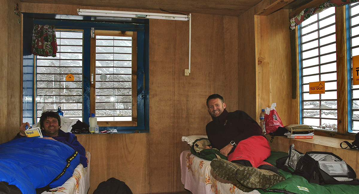Teng Kangpoche and Panayo Tuppa, with prayer flags, outside Thame Lodge