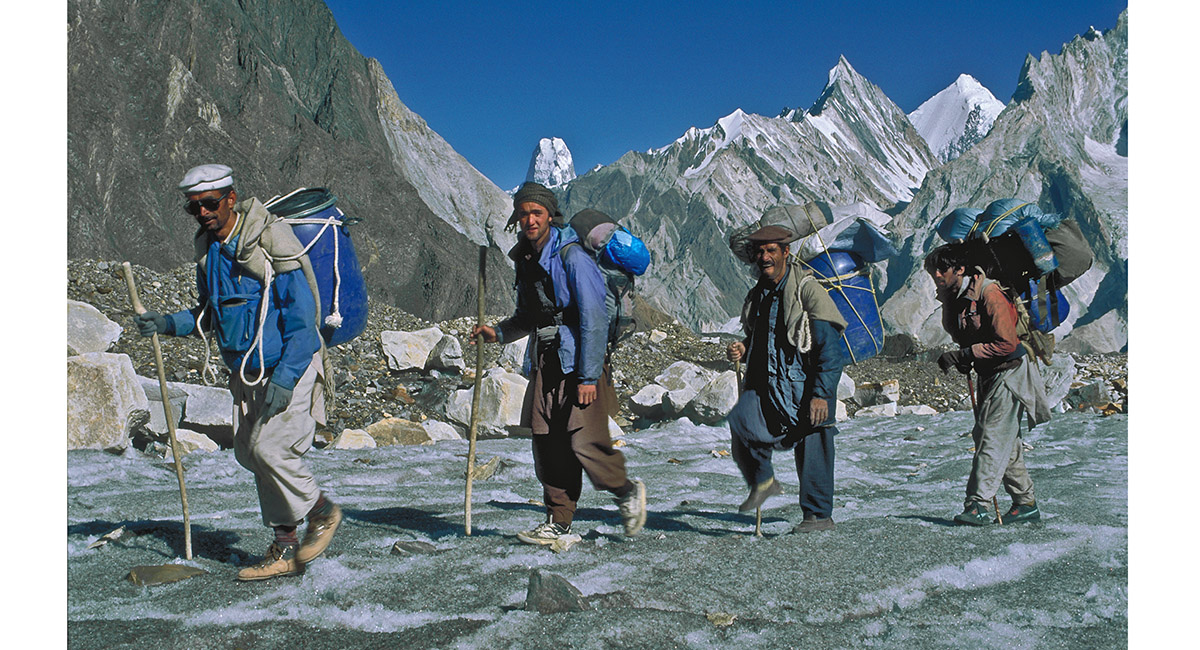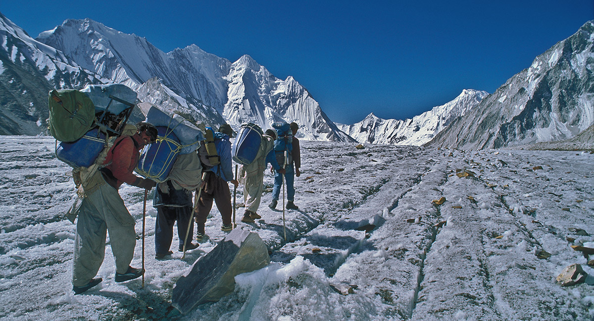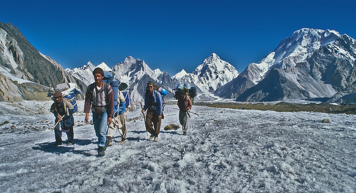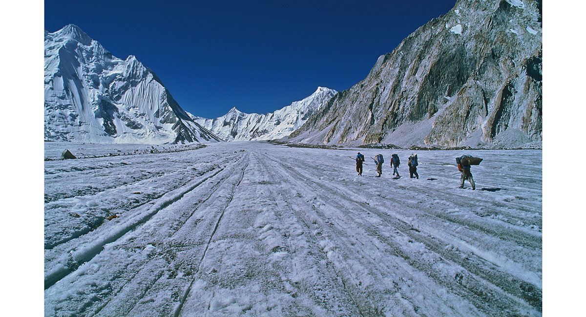 The "A" team plods on to the Vigne glacier. The striking tower on the left is Muztagh Tower (7,273m). The very sharp rock peak is Cristal Peak (6,252m) and the snow pyramid behind is Skilbrum (7,360m)