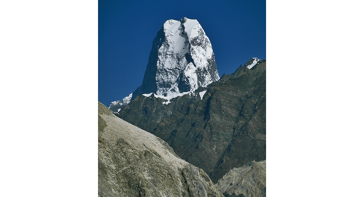 Crossing to the South side of the Baltoro glacier, en route to the Vigne glacier. Here Mitre Peak pierces the blue-black sky