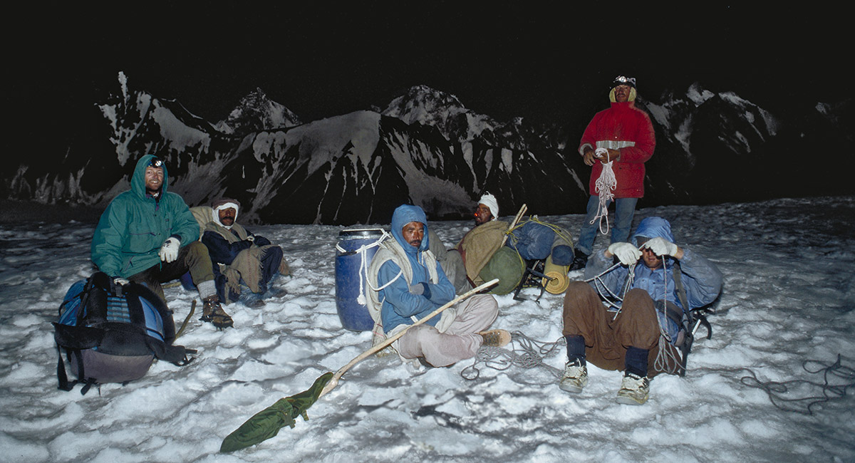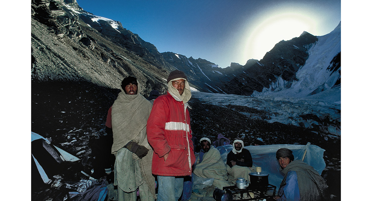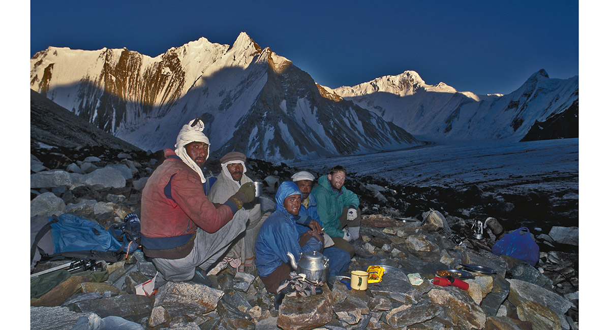 Dawn at High Camp (5,100m), on the West (Hushe) side of Gondogoro La. The pass is a little to the left, above Ibrahim's (red jacket) head
