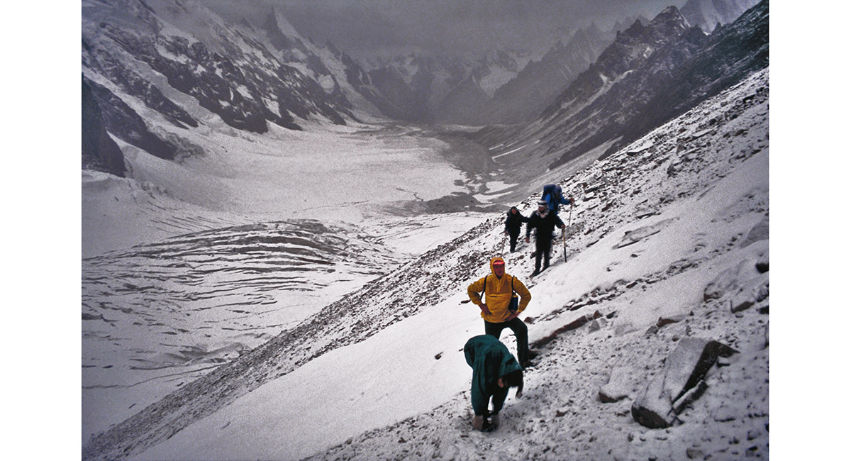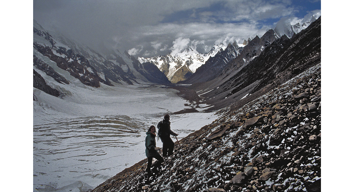 Even without a backpack to contend with, this climb was demanding in the thin cold air above 5,000 metres. Although the view of K2 on the other side of the pass was not at its best due to the cloudy conditions, the sight back down from where we had climbed made every gasping step well worth the effort (First visit 1992)