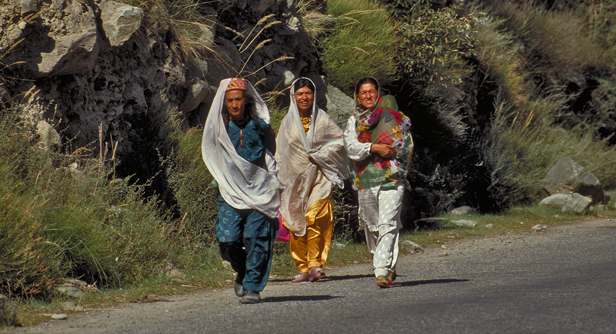 Three Nagarkut women approach, all wearing the colourful clothing and, in one case, the round embroidered hat, that typifies their particular style of dress