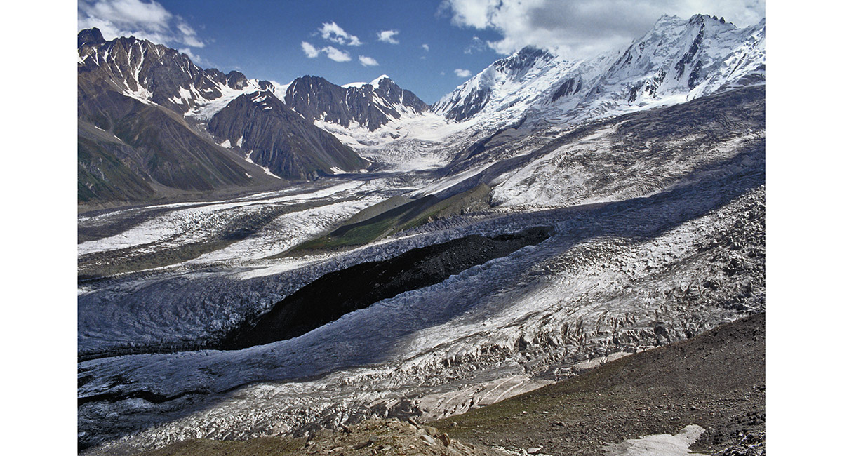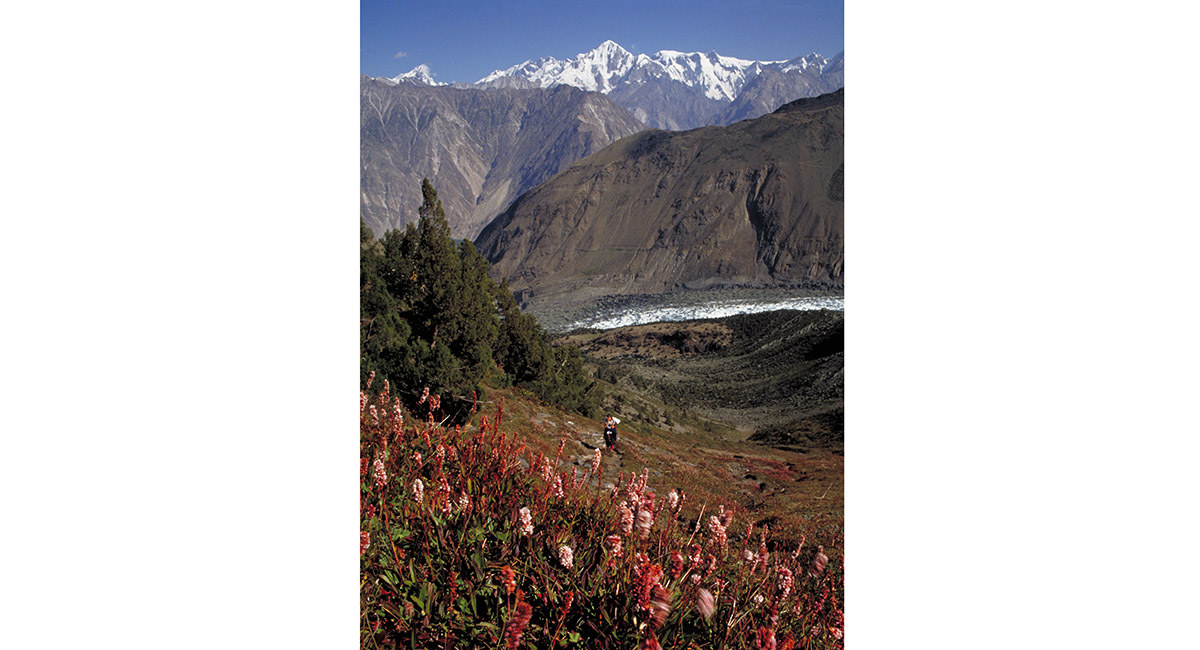 Walking up from Minapin to Rakaposhi base camp initially takes you along the side of Minapin glacier. Further up, the trail leaves the moraine for a time, passing through lush mountain pastures and then up this steep incline, before rejoining the moraine. The gleaming ice of Minapin glacier is seen clearly here as a bright white line. The glacier is very steep and fast moving, leaving little chance for debris to build up on its surface