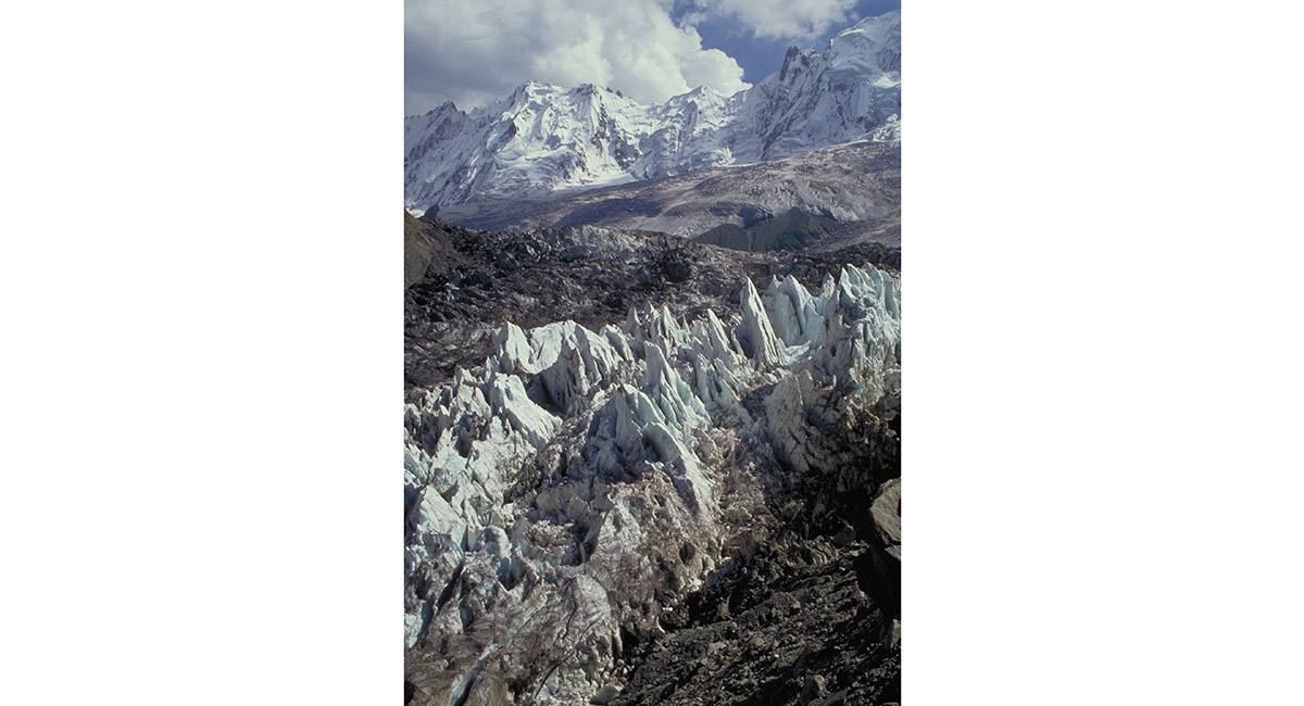 A closer inspection reveals dramatic house-sized ice pinnacles crowded into the narrow neck of Minapin glacier. Towering above and feeding the glacier is the snow and ice covered 7,279 metre Diran Peak