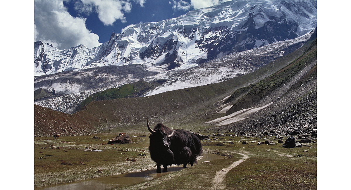 Taking it easy in the 4,500 metre meadow of Rakaposhi base camp was this fine specimen of a Yak. Although a magnificent beast, larger than life with his thick coat of chocolate brown hair, he still appears tiny before the indomitable bulk of Rakaposhi