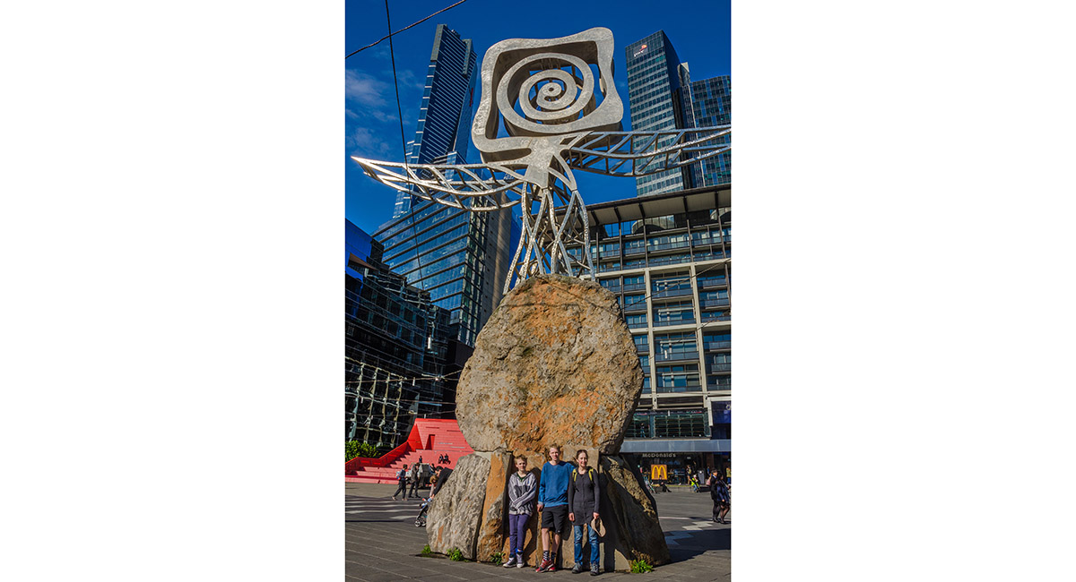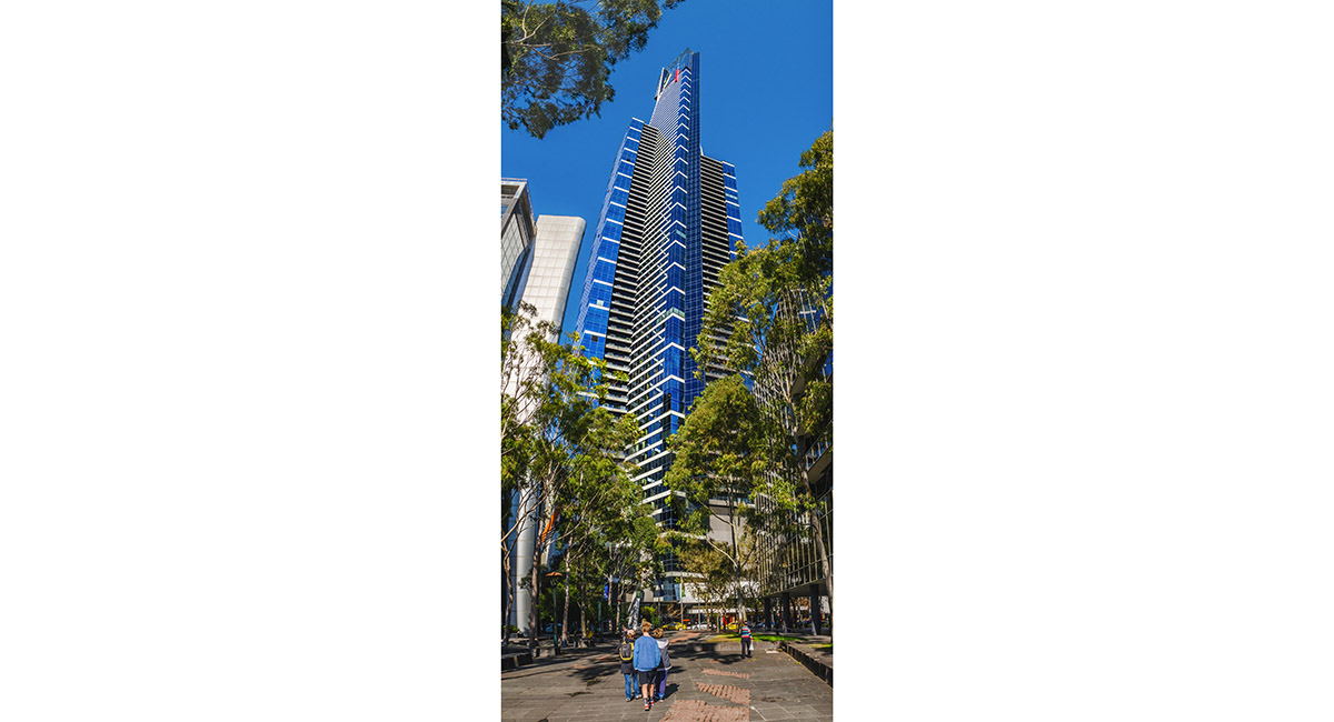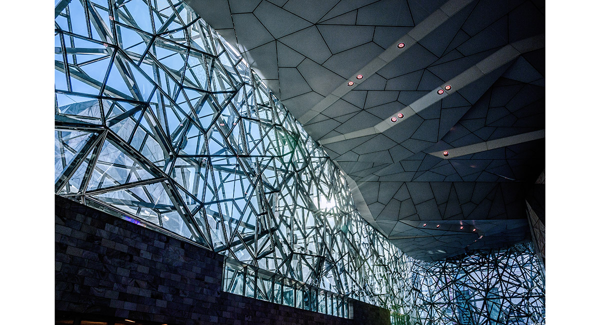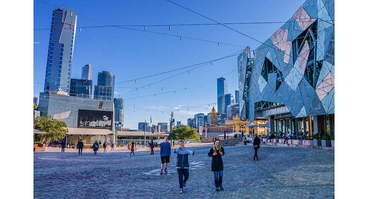 Skyscrapers at dusk, viewed from the Melbourne Aquarium, beside the Yarra River