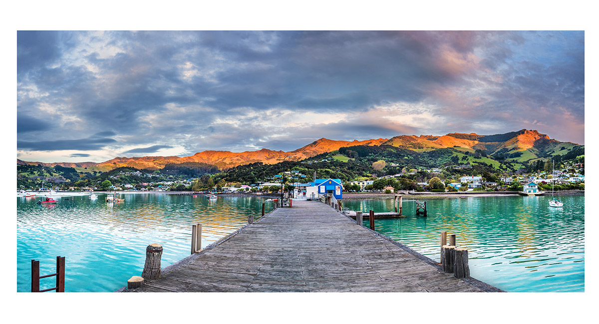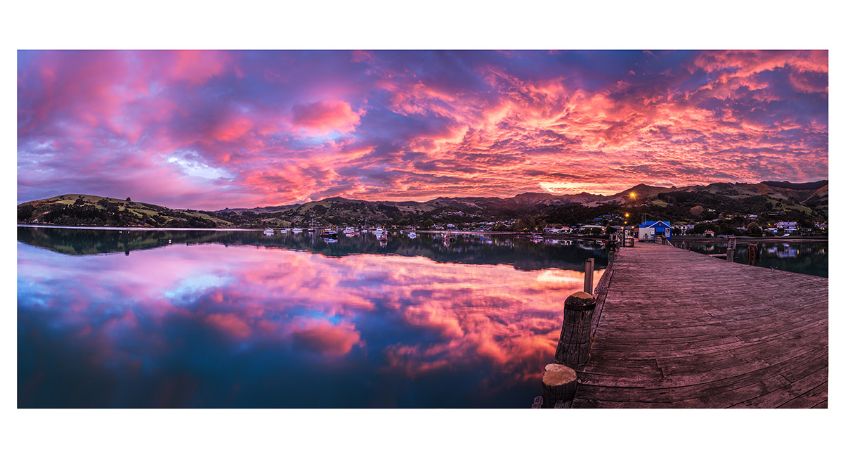 A sunset view east from the main pier at French Bay, to Stony Bay Peak (806m) and Flag Peak (809)