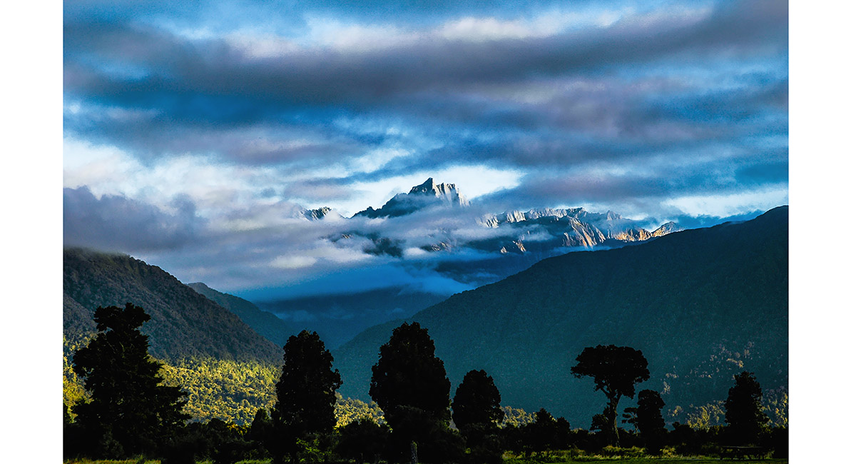 Mount Tasman (left, in cloud) and Aoraki Mount Cook (right), at dusk