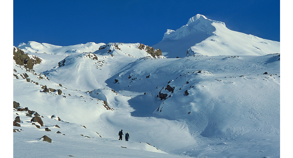 View from Tukino Village - from left, Mitre/Ringatoto Peak, Pyramid Peak, the Cathedral Rocks and Te HeuHeu