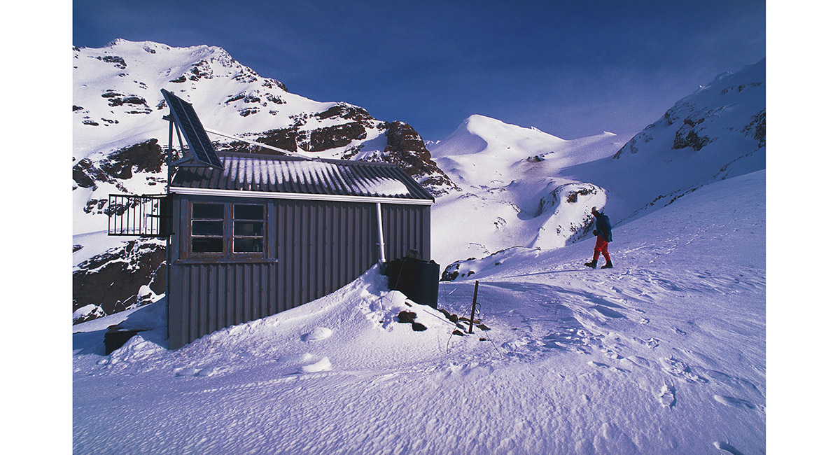 Whangaehu Hut (2,050m), with Mitre/Ringatoto Peak (2,591m) above and Pyramid Peak (2,645m) centre