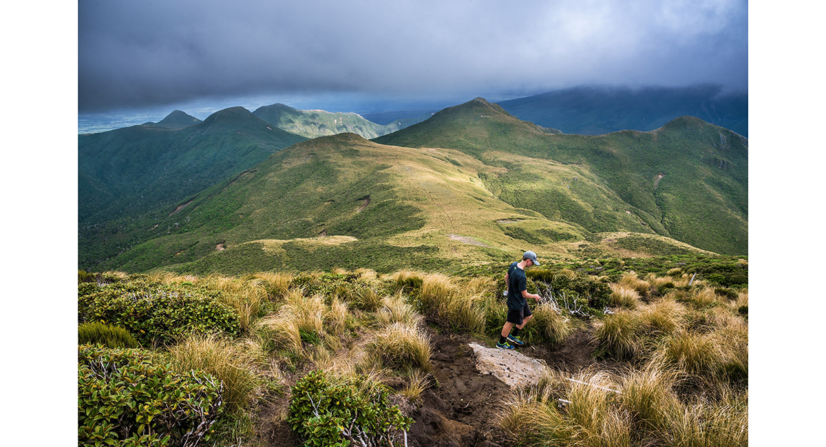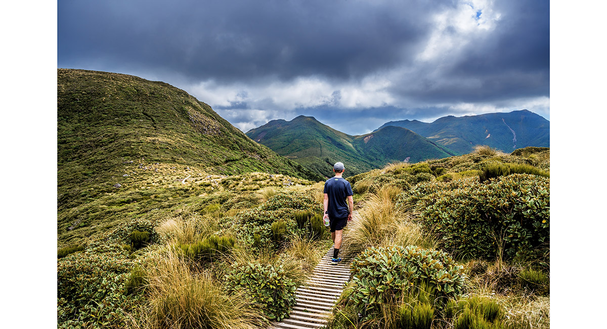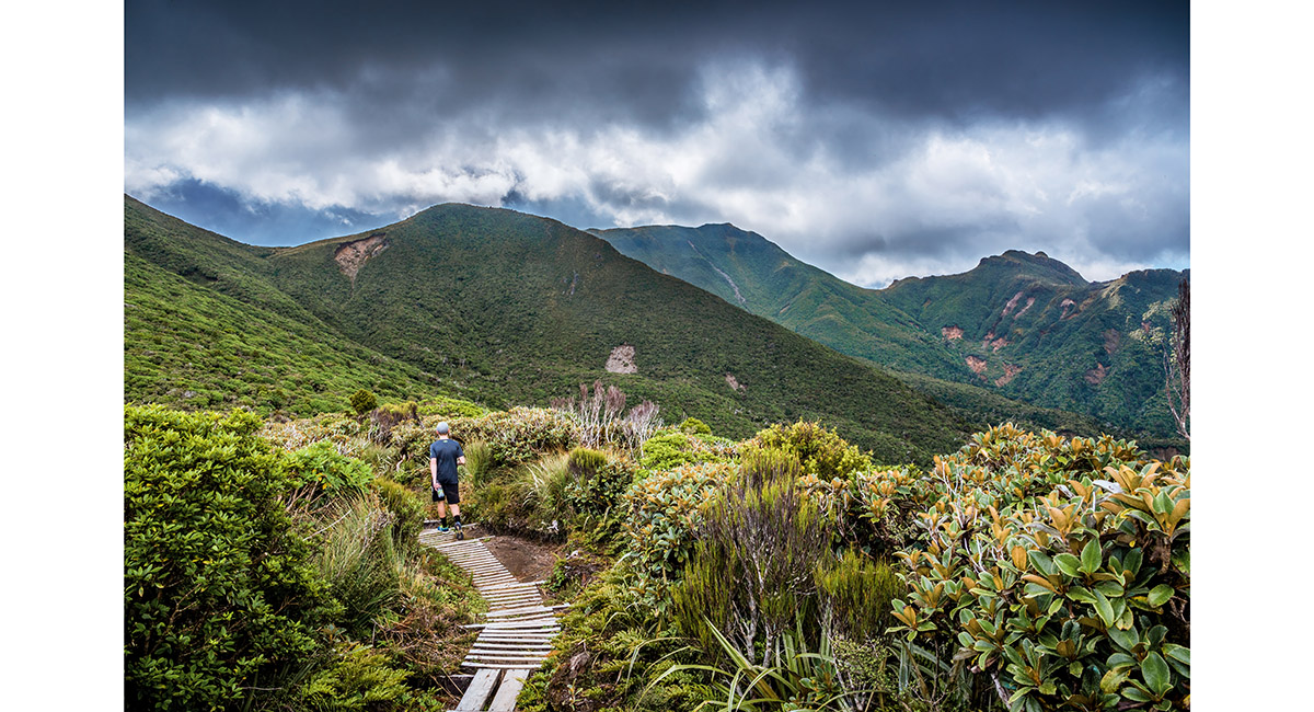 On the Pouakai Track, passing the Hump (1,292m - left), en route to Pouakai (1,400m - far right skyline)