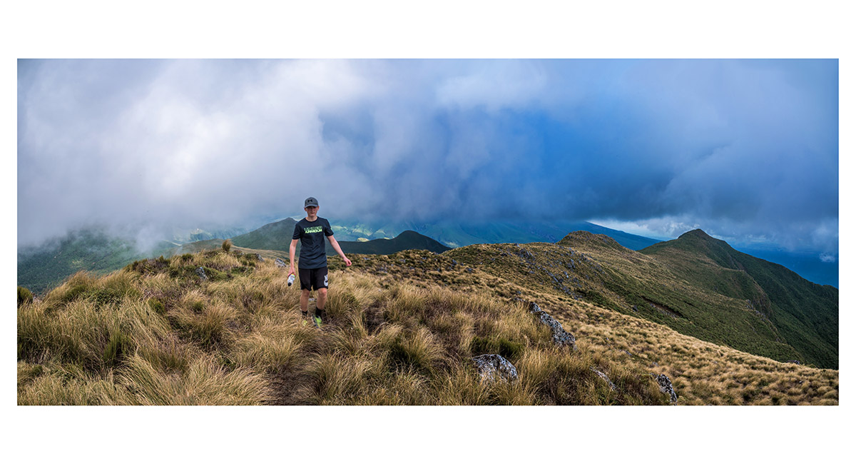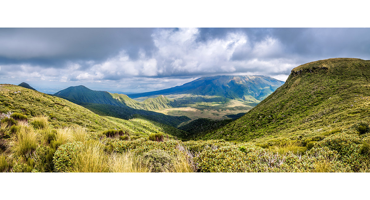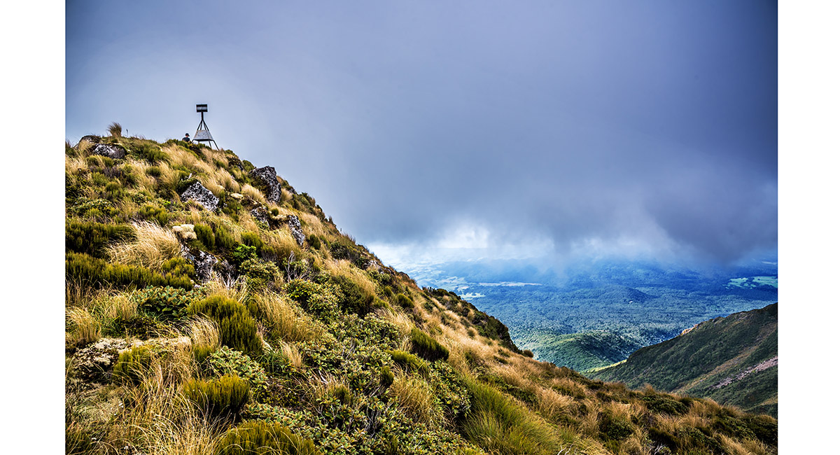 A view south east to Mount Taranaki (covered in cloud) from the summit of Pouakai (1,400m)