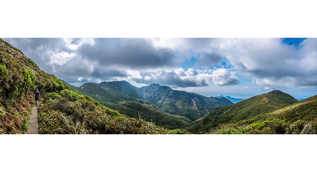 On the Pouakai Track, looking south east to Mount Taranaki covered in cloud, with the Hump right