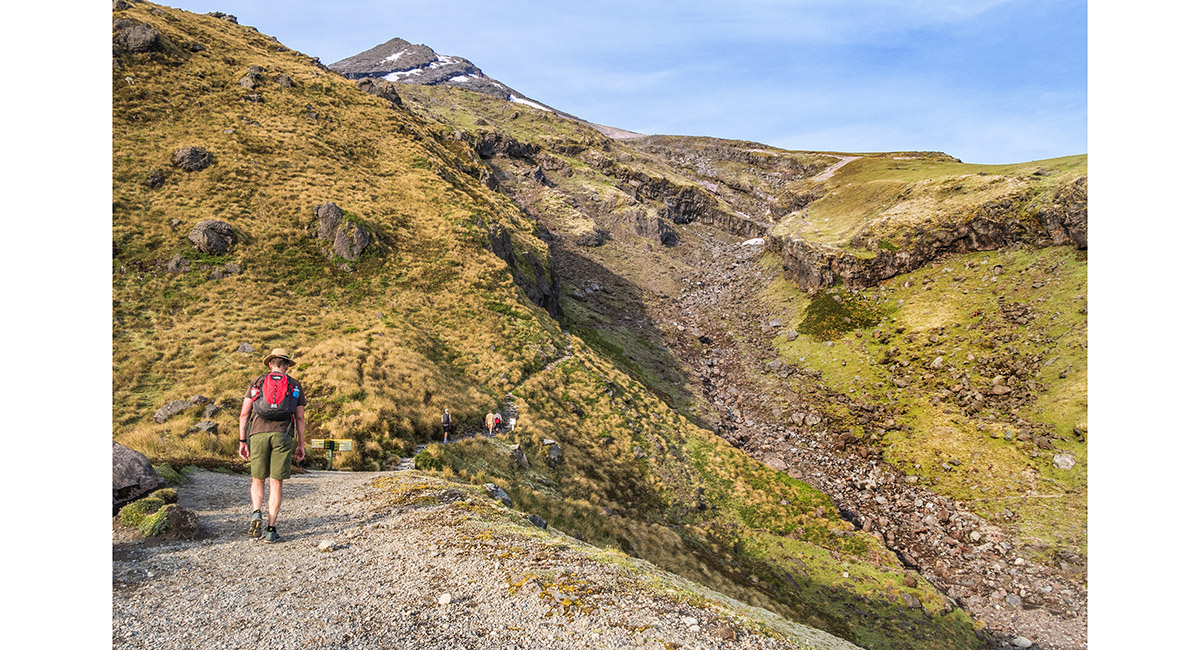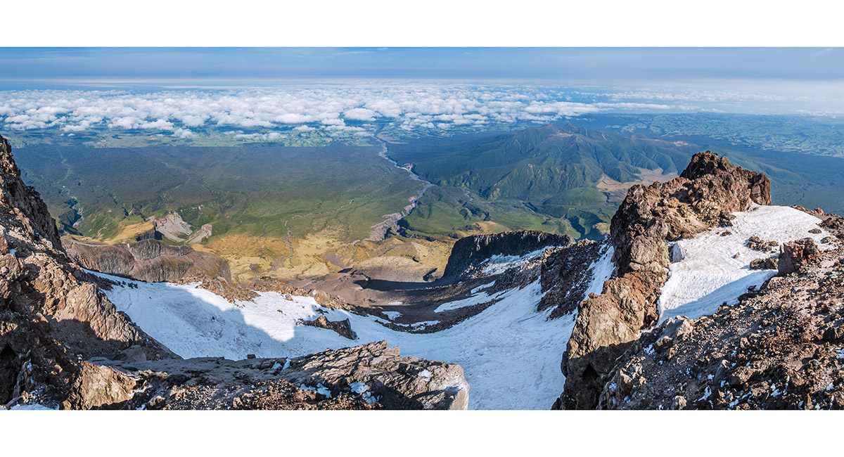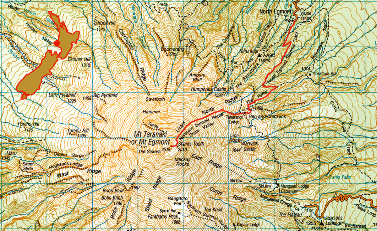 At the top of the Lizard on the little shelf at 2,430m giving access to the summit crater. The Pouakai Range are at top left
