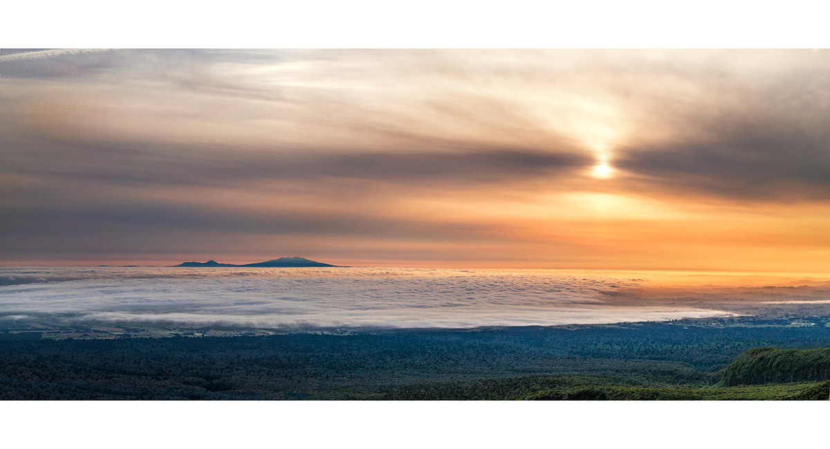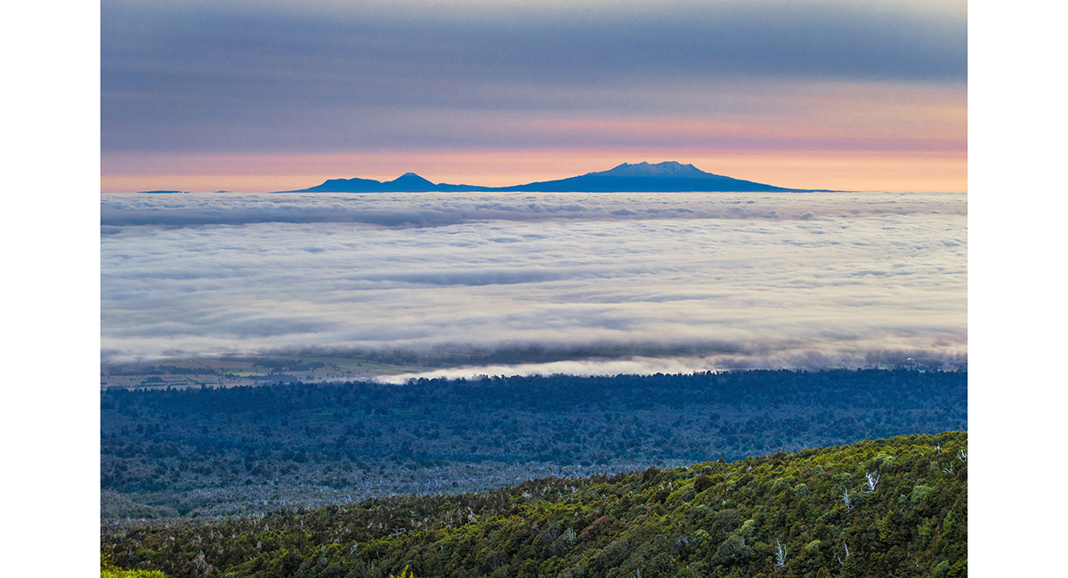 From left, Mounts Tongariro, Ngauruhoe and Ruapehu, viewed from about 1,100m on the North Egmont summit track at dawn
