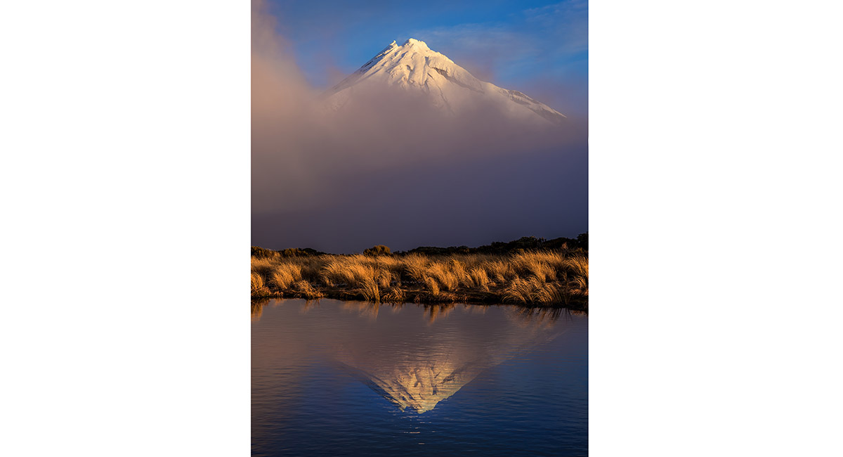 Mount Taranaki looms above swirling cloud at sunset, Pouakai Track tarns